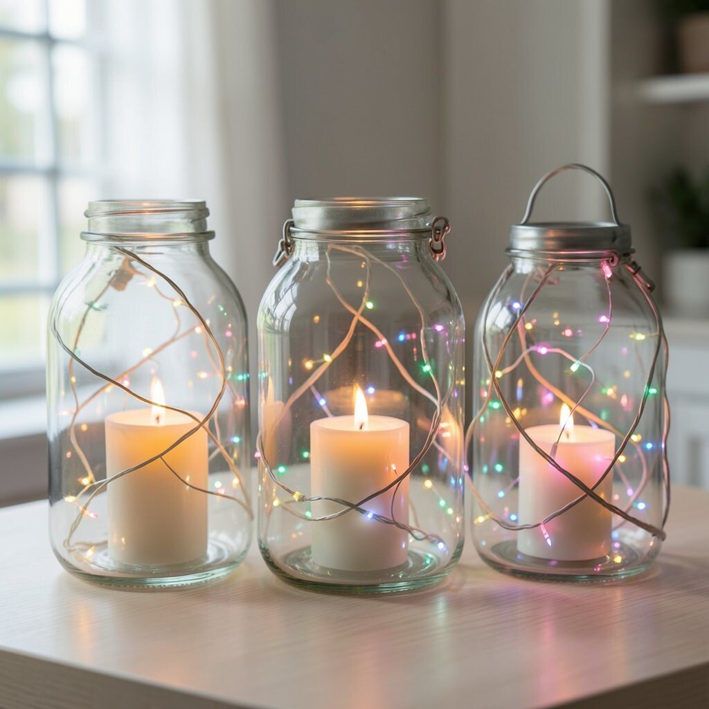 Colored fairy lights can make glass lanterns feel fun while still looking neat and pretty. Soft pink, gold, or cool blue lights can change the whole mood of a room.