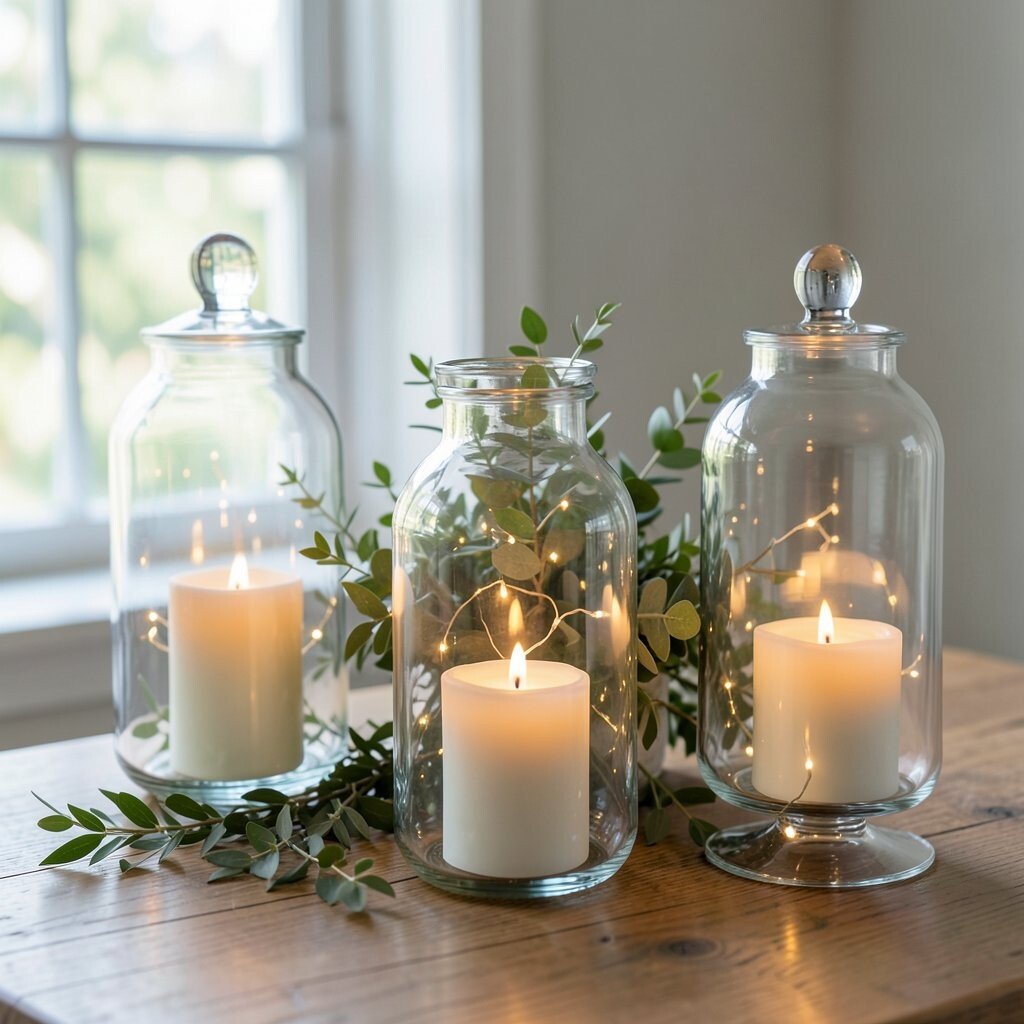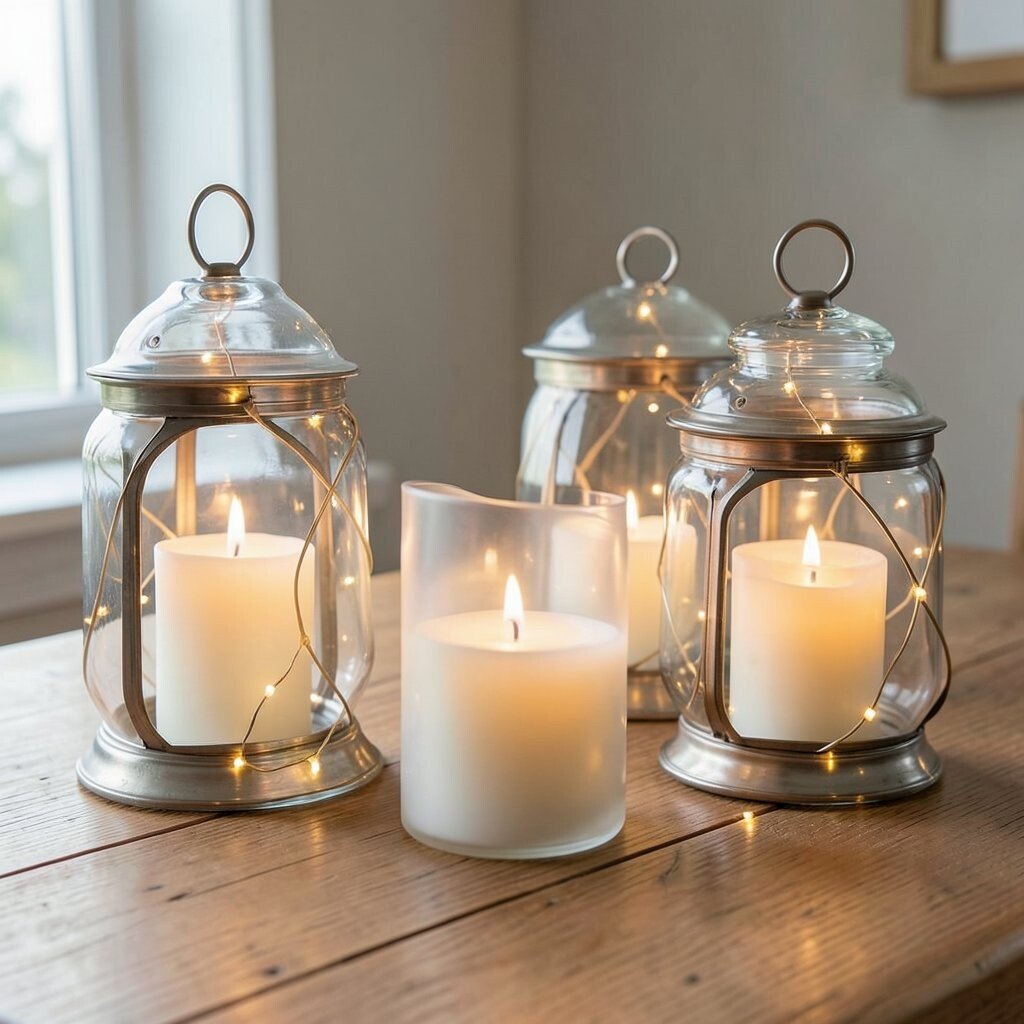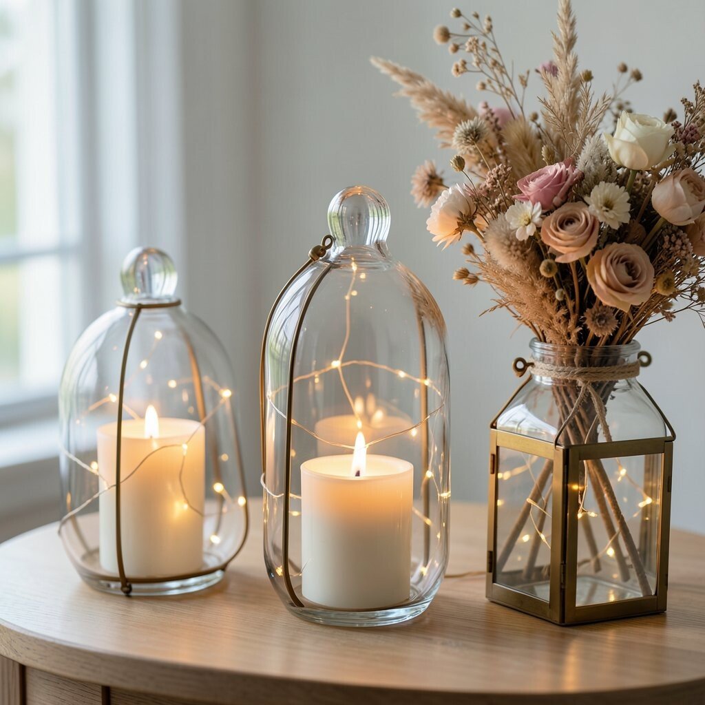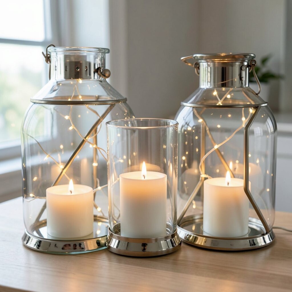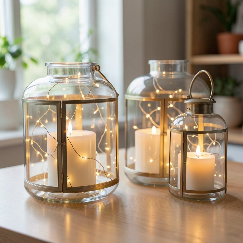 Clear glass lanterns filled with warm white fairy lights look clean, bright, and timeless. They fit on dining tables, coffee tables, and sideboards without feeling heavy.