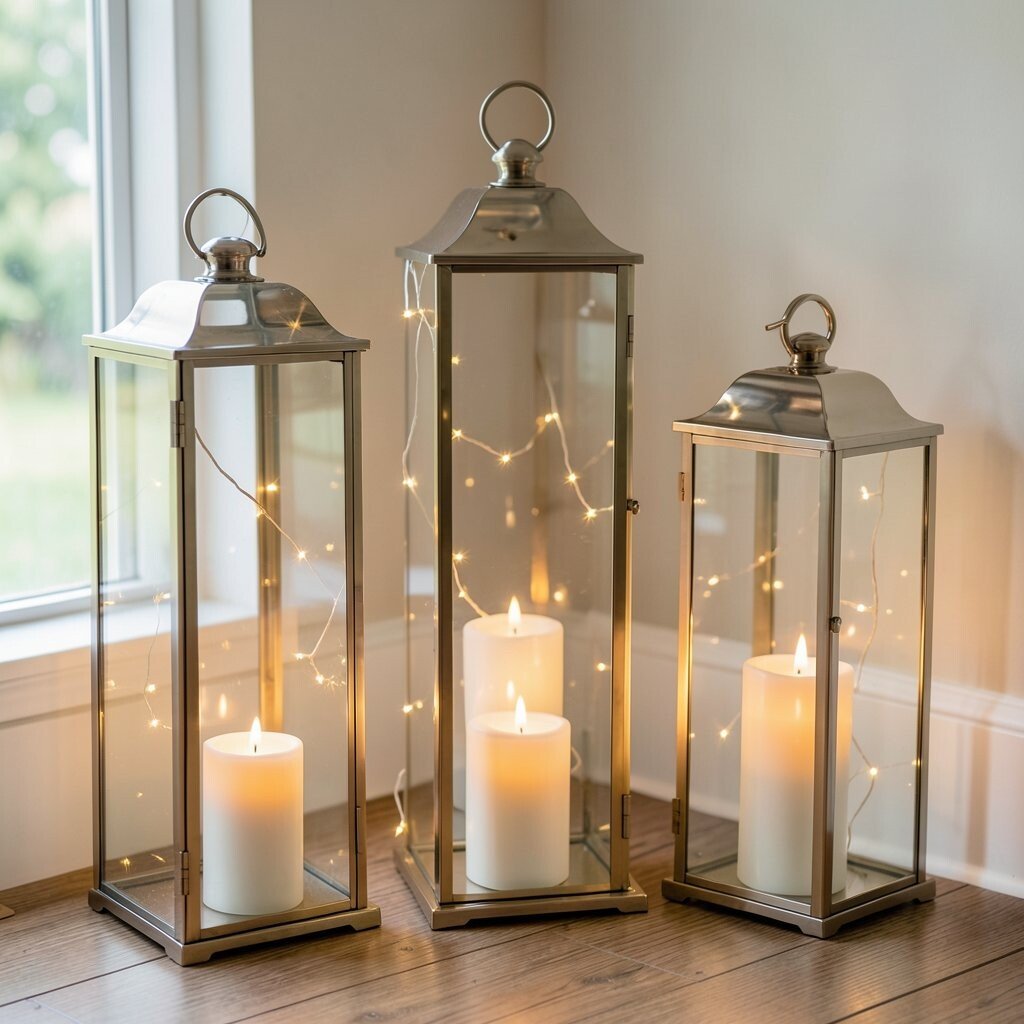 Brass frames and glass panels give lanterns an old-world charm. The fairy lights inside add a soft sparkle that feels rich and classic.