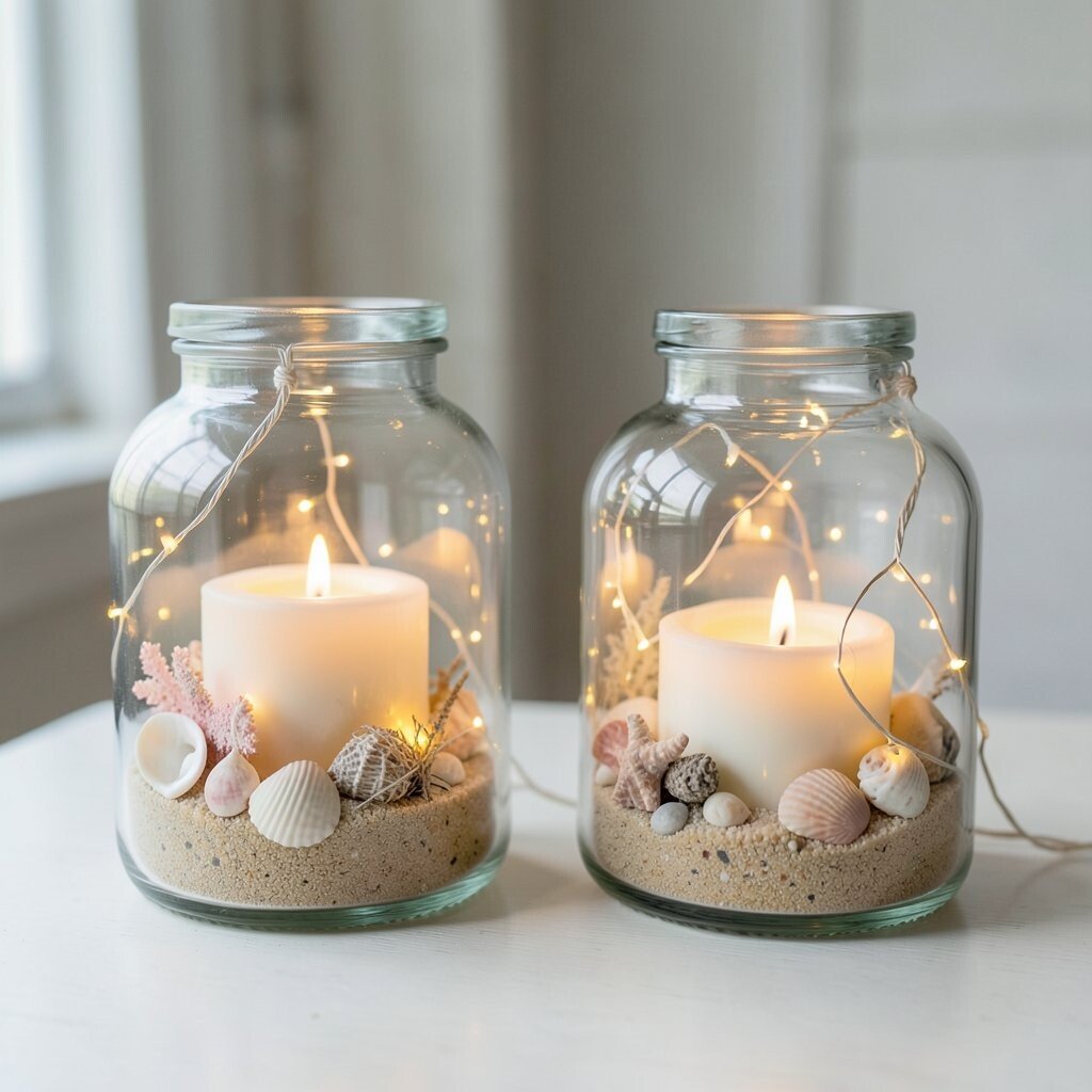 Glass lanterns filled with sand and shells feel breezy and relaxed. The fairy lights add a soft shine that looks like sunset on the beach.