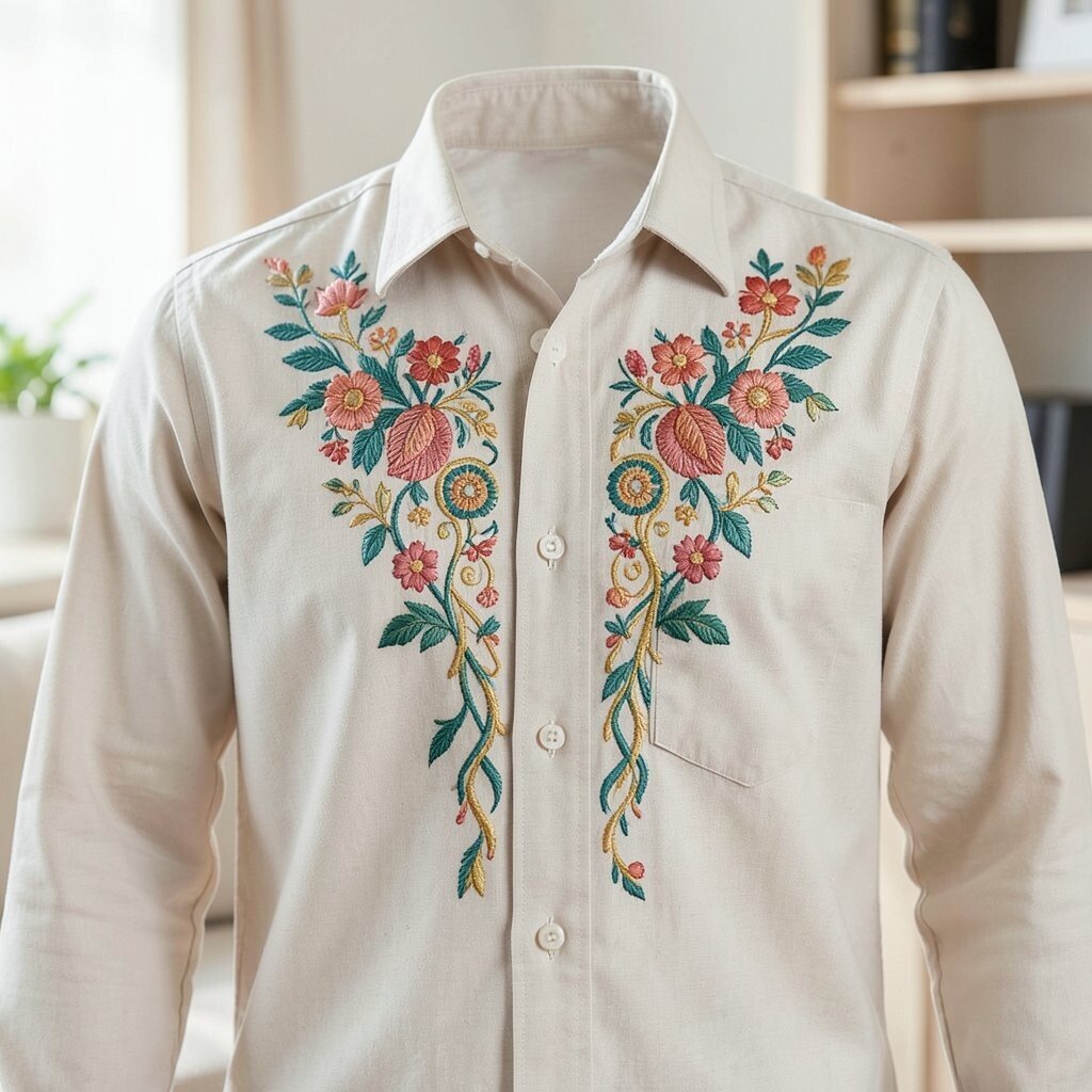 Celebrate the changing seasons with embroidered shirts depicting scenes like falling leaves or blooming flowers. These designs reflect the beauty of nature’s cycles.