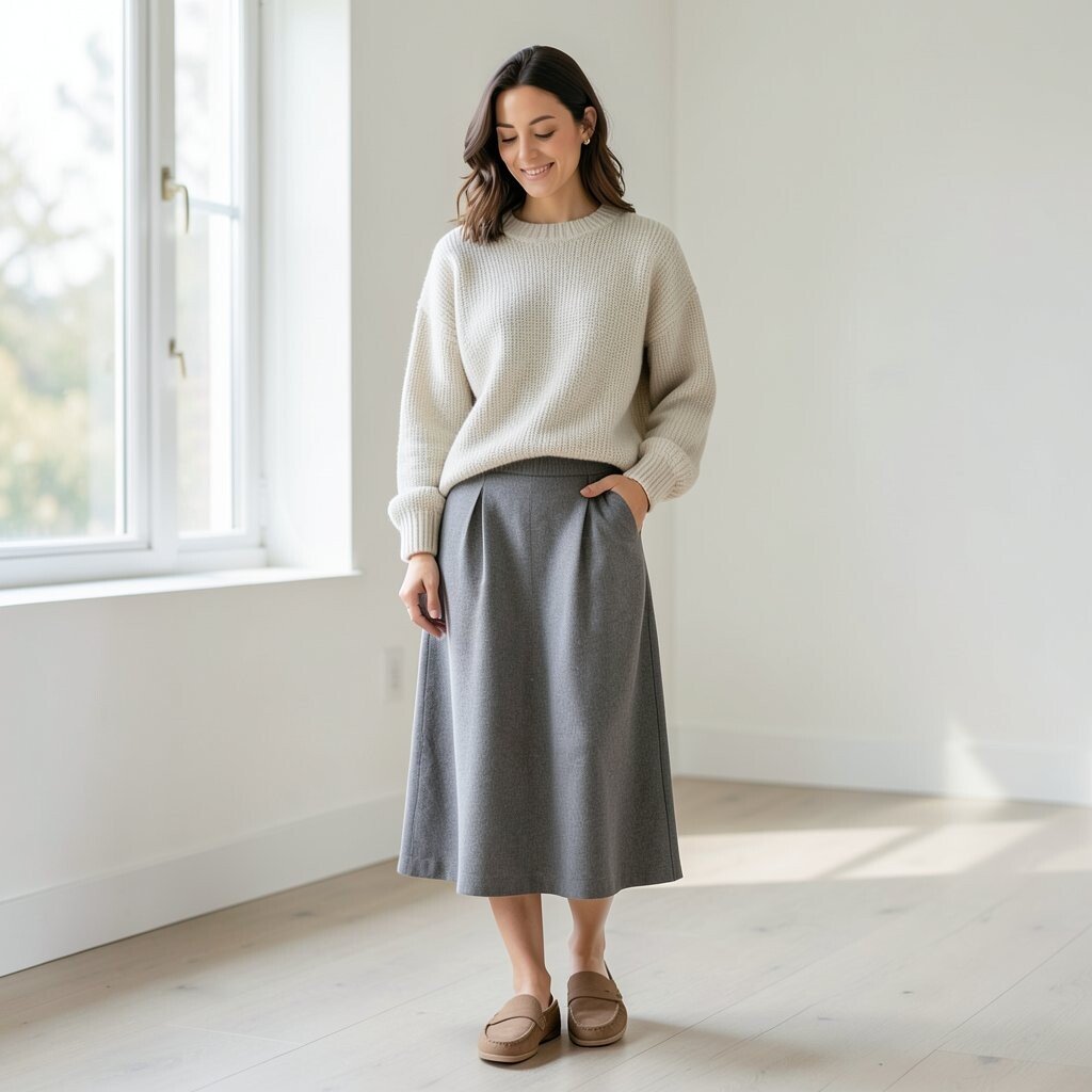 Pick a pleated skirt for movement or a smooth skirt for a clean line. A soft sweater adds warmth and makes the outfit feel cozy for cooler days. This is a nice choice for work, lunch, or a casual date, and you can make it more unique with bright socks or a printed bag.