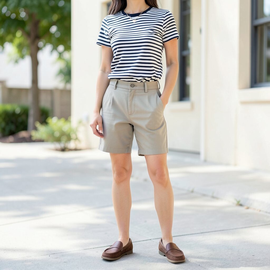 Tailored shorts make loafers look neat and smart. A striped top brings in a fun, fresh feel that never gets old.
