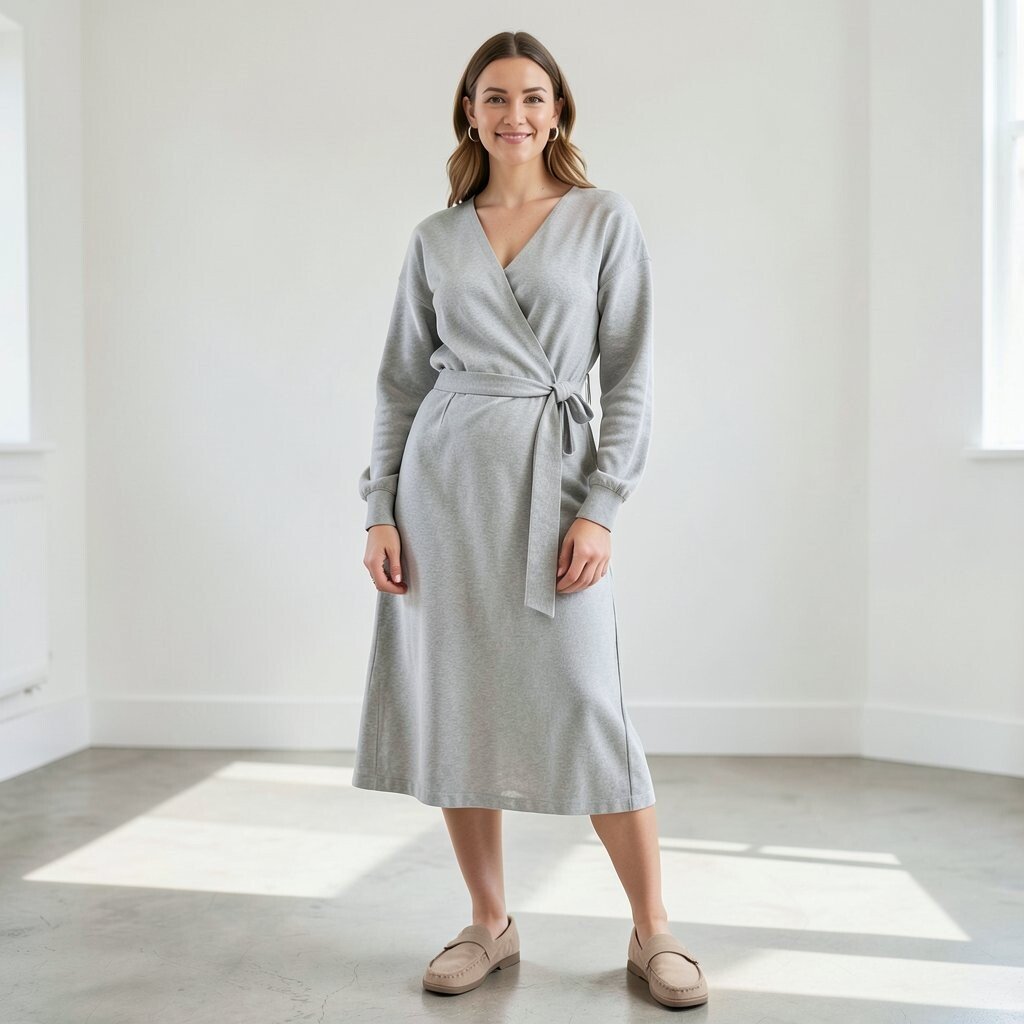 A wrap dress moves softly and gives a flattering shape. Loafers add a steady, everyday feel that keeps the dress from seeming too formal.