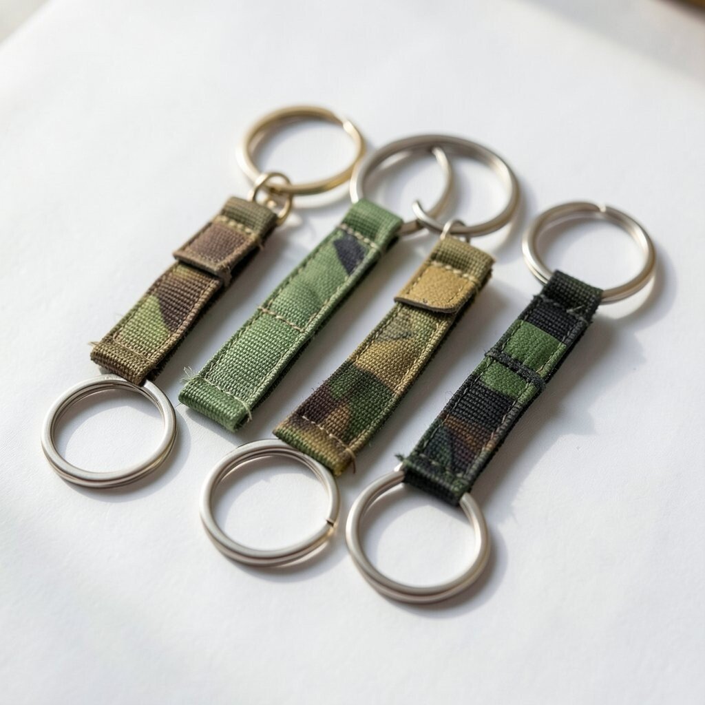 Camouflage fabric keychains are rugged and adventurous. They feature classic camo patterns in green, brown, and tan. Perfect for those who love the outdoors.