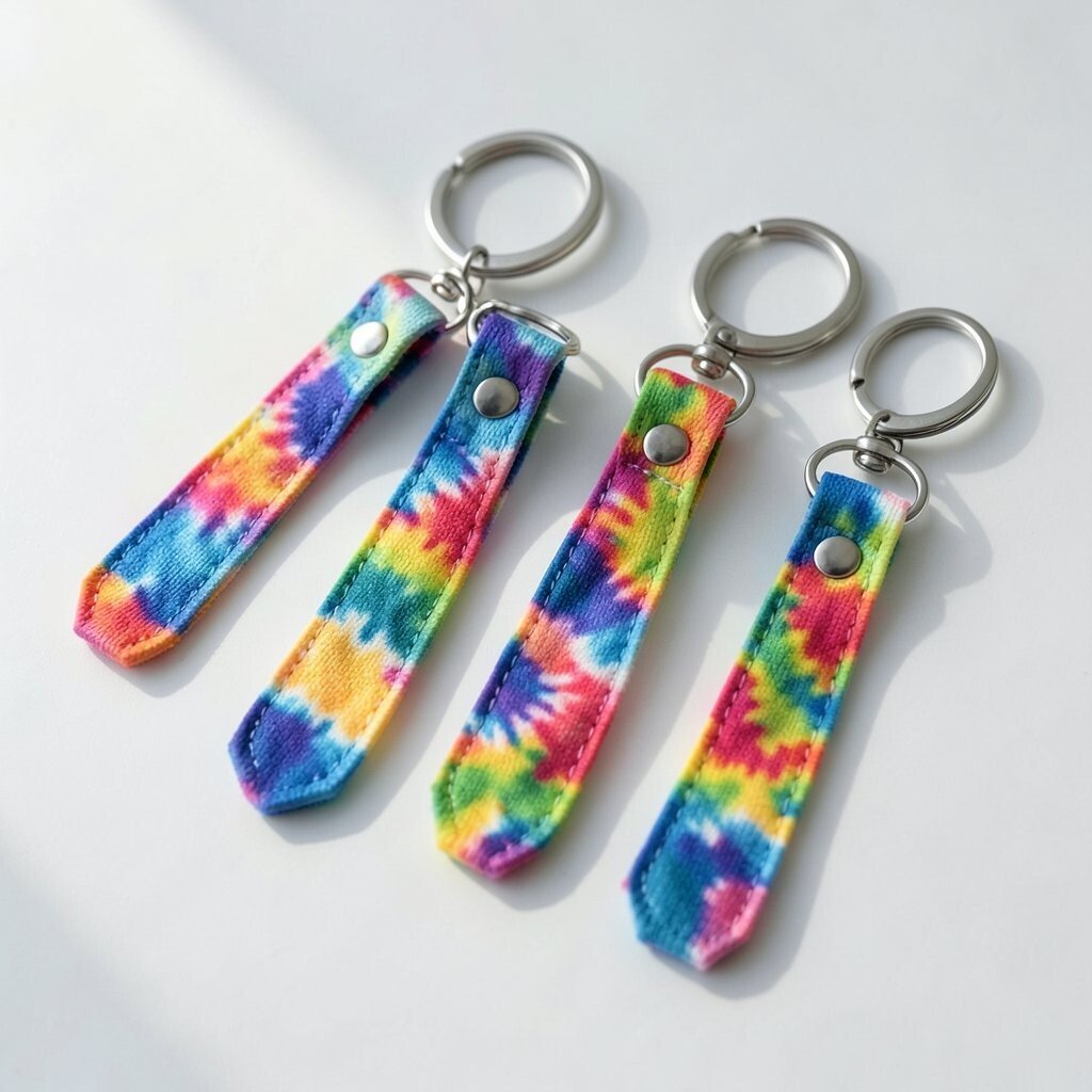 Tie-dye keychains are bursting with color and fun. Each keychain is a swirl of vibrant hues, reminiscent of the 60s and 70s. They’re perfect for anyone who loves a pop of color.