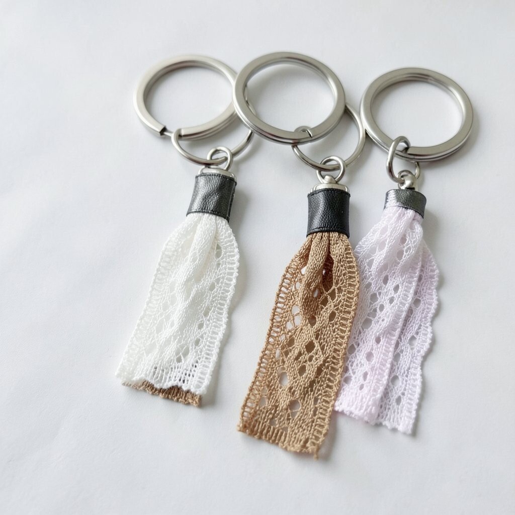 You can find lace keychains in various designs, from simple lace strips to complex lace flowers. They make great bridal party gifts or accessories for a lace-themed outfit. A little bit of lace goes a long way!