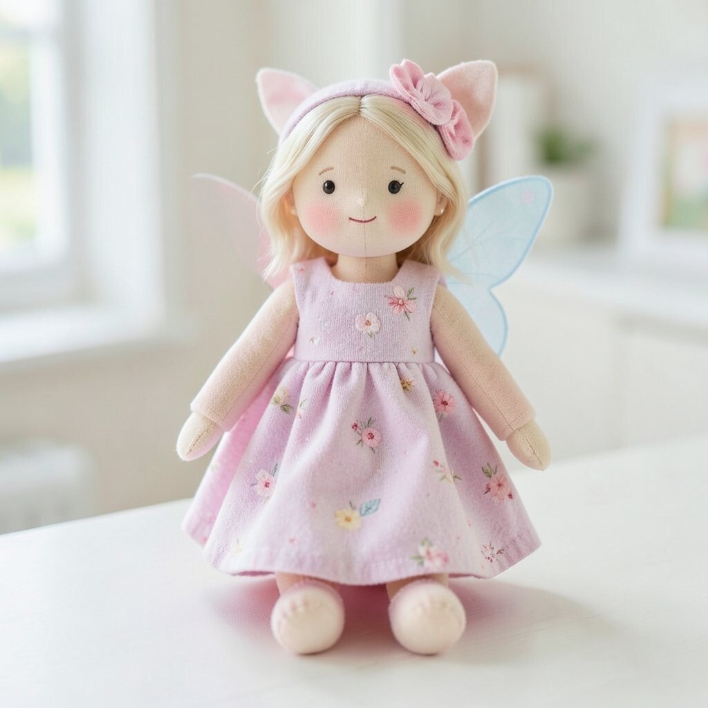 Make the wings from felt petals and the body from cotton or flannel. A small ribbon waist or stitched flower crown adds a sweet finish. This toy can be made cheaply if you use scrap fabric and simple stuffing.