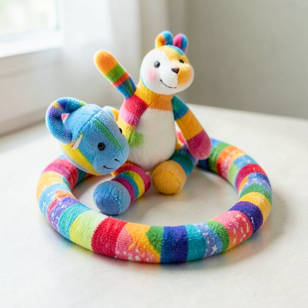 A rainbow fabric snake can curl, coil, and stretch in a fun way. Bright stripes make it look lively and full of energy.