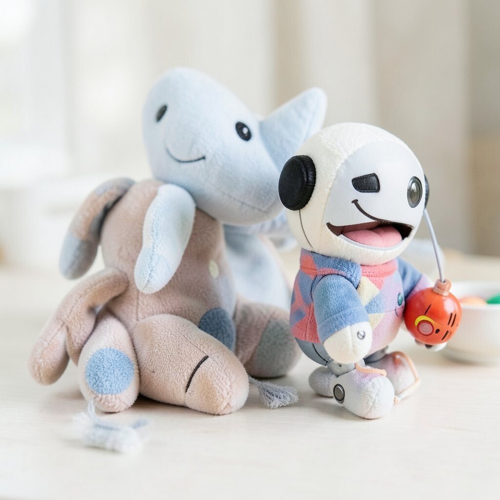 A mini robot plush can look fun and modern with square shapes, stitched buttons, and bright eyes. It has a playful mix of soft fabric and machine-like style.