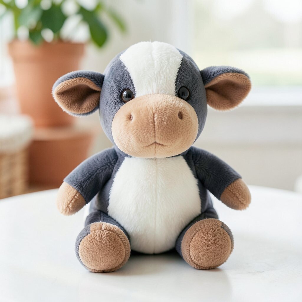 A farm cow plush has a gentle look with floppy ears, a round snout, and patchy spots. Black and white fabric gives it a classic farm feel, while pink spots make it more playful.