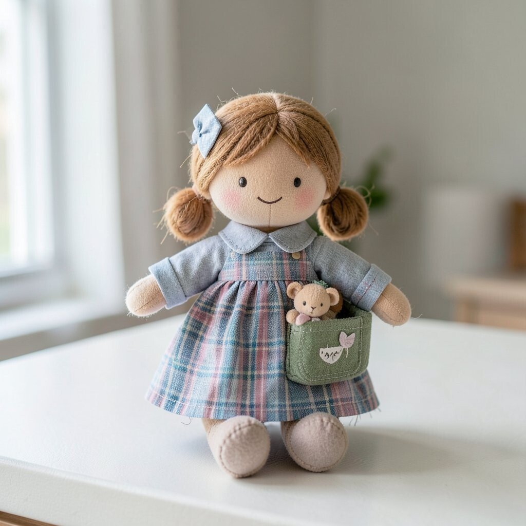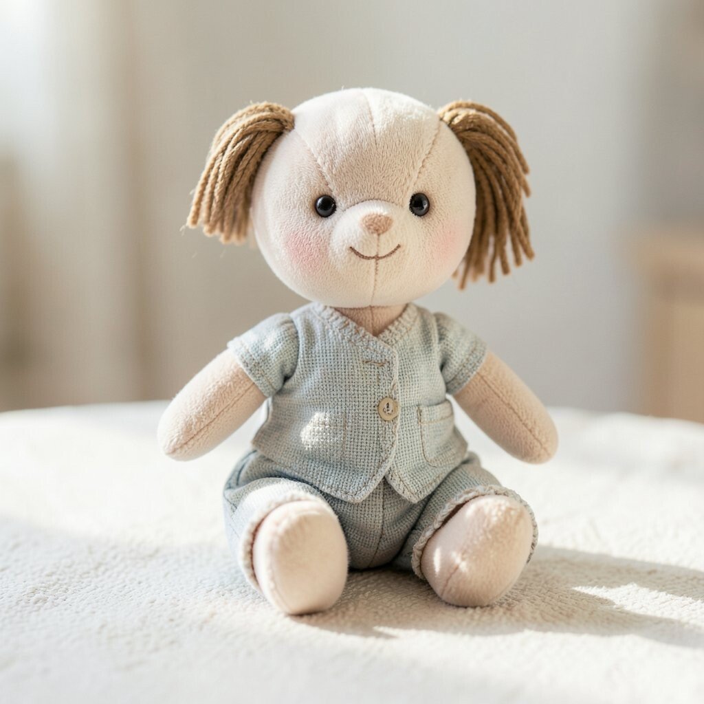 A flat comfort doll feels soft and light, with a simple body that is easy to hold. Its face can be gentle and calm, which makes it a nice bedtime friend.
