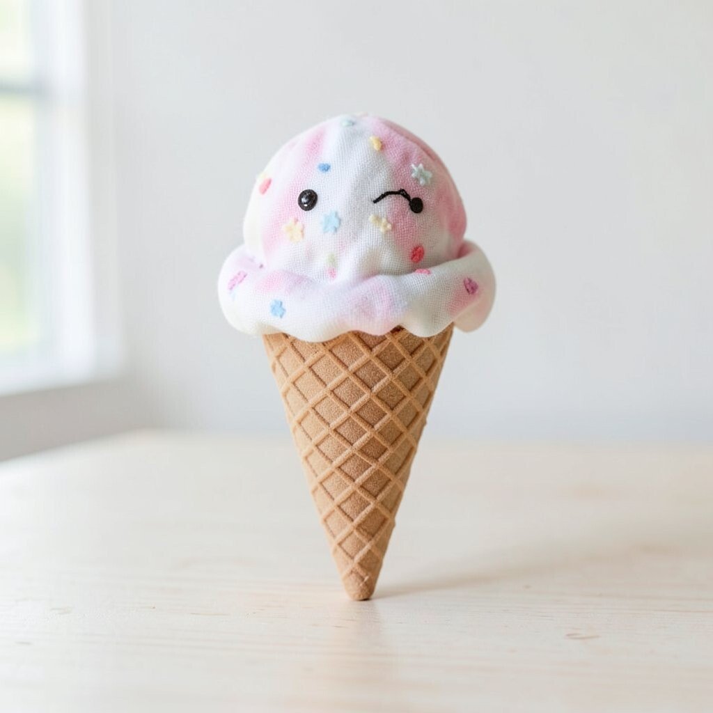 Felt works well for the cone, while cotton or fleece can make the scoop feel fluffy. A few stitched sprinkles or tiny fabric dots add a fun finish. This toy is perfect for pretend play, summer displays, or a sweet nursery shelf.