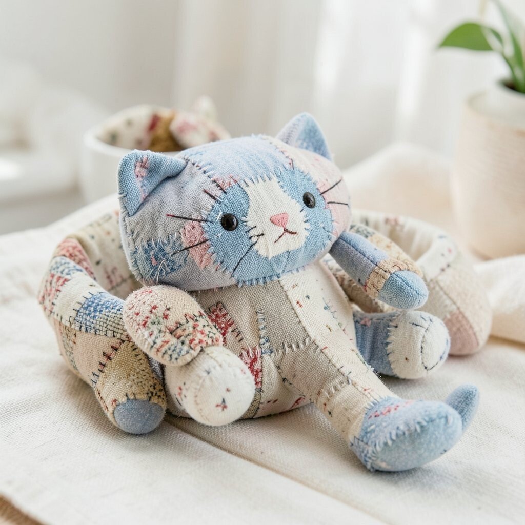 A patchwork cat has a playful look with mixed colors and stitched shapes. Its mismatched body gives it a homemade charm that feels warm and cheerful.