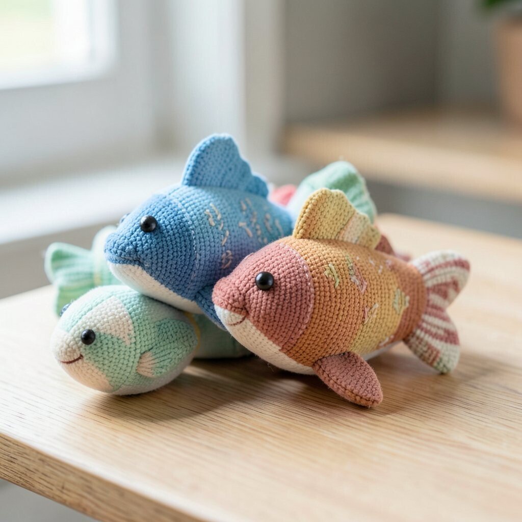 A stuffed fish can shine in bright blues, oranges, or rainbow stripes. Its smooth shape and stitched scales make it look lively and cheerful.