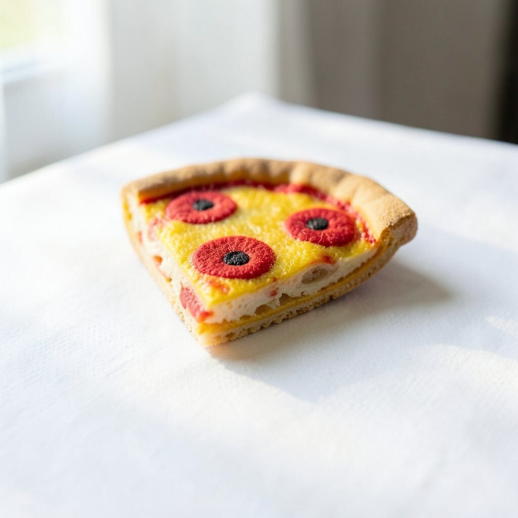 A tiny pretend pizza slice looks funny and delicious with a triangle shape and bright toppings. Felt pepperoni, green peppers, and cheese bits make it look extra tasty.