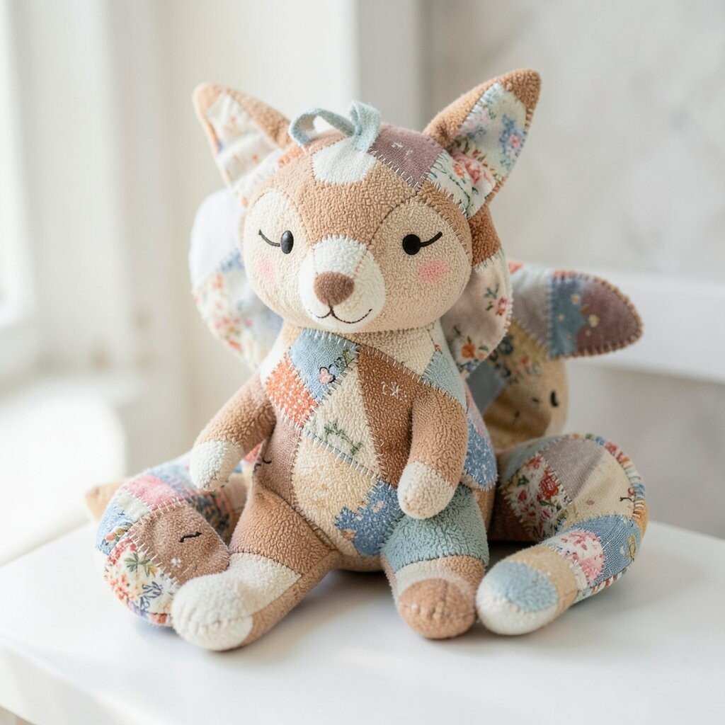 You can personalize the fox with a scarf, a leaf, or a stitched star on the belly. It fits current nature-inspired and woodland nursery trends very well. A handmade fox like this feels special because no two patchwork pieces will ever look the same.