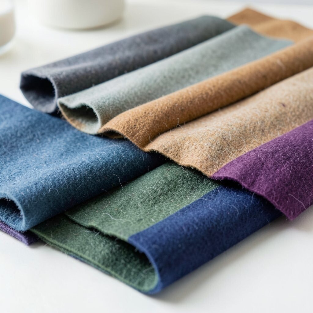 Felt has a dense, fuzzy surface and no woven grain, so it feels different from most fabrics. It comes in bright colors and cuts cleanly without fraying much.