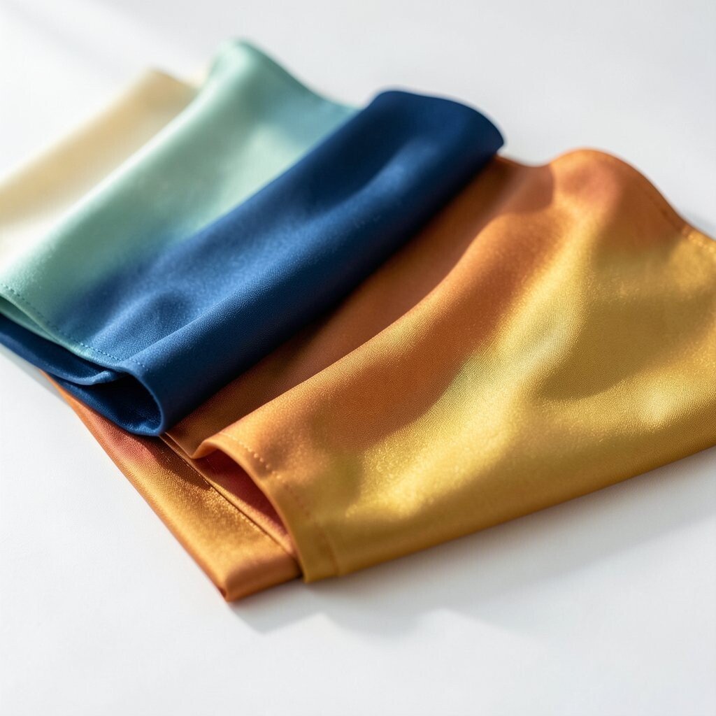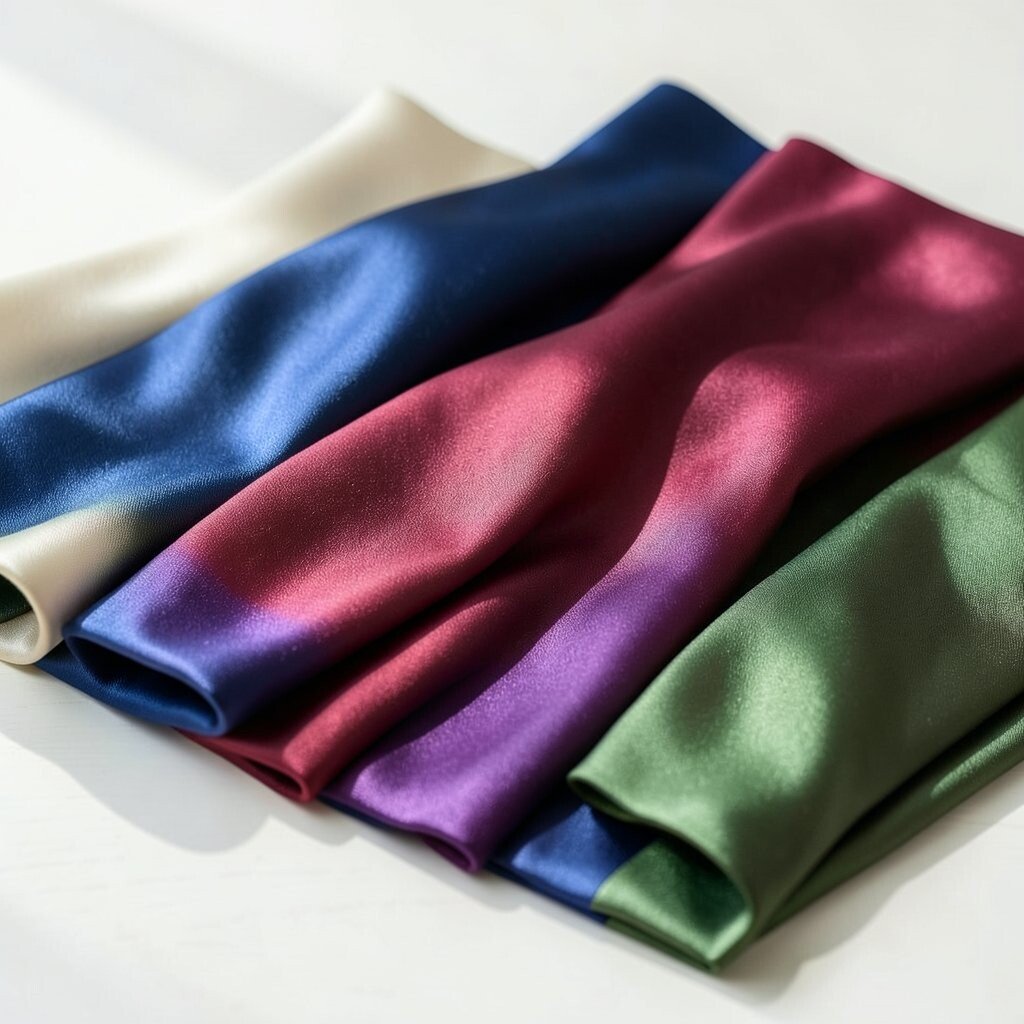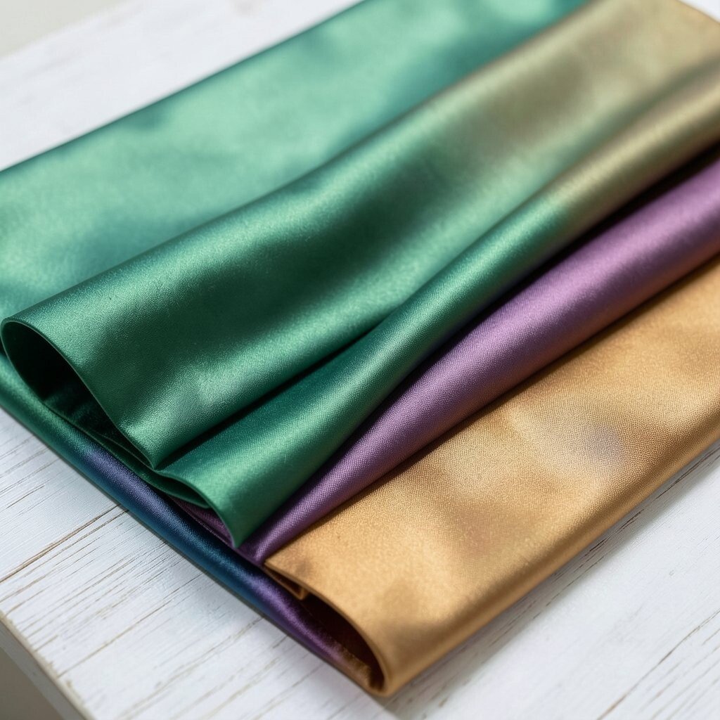 Satin has a glossy front and a smooth, slippery surface that shines in the light. It looks dressy and polished, even when used in small amounts.