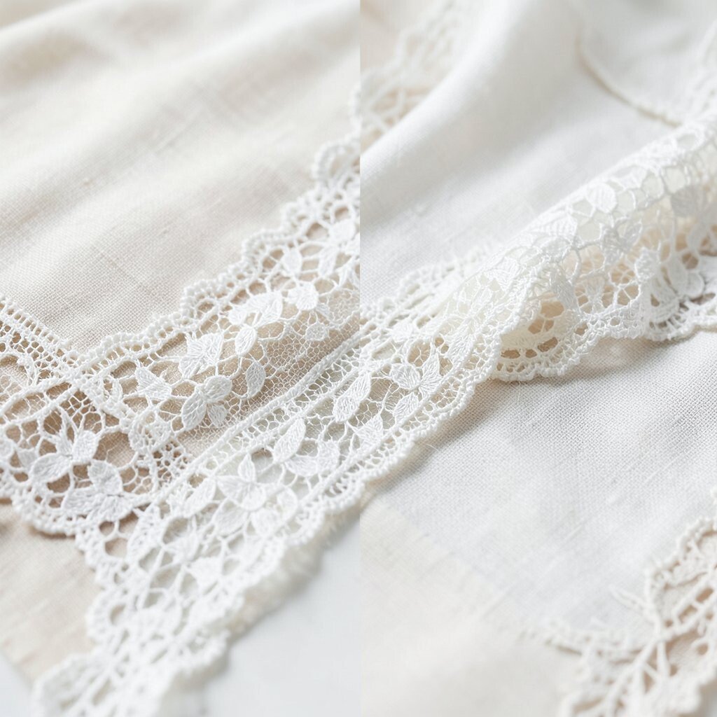 Lace has open patterns that look delicate and pretty. It can be fine and soft or bold and graphic, depending on the design.
