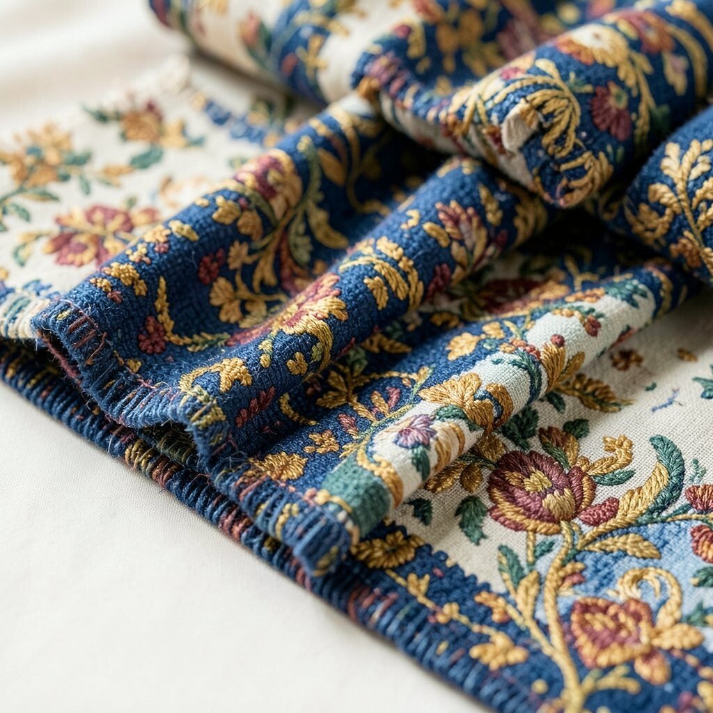 Brocade has woven patterns that often look raised and rich. The surface can feel ornate and formal, with a bold look that stands out fast.