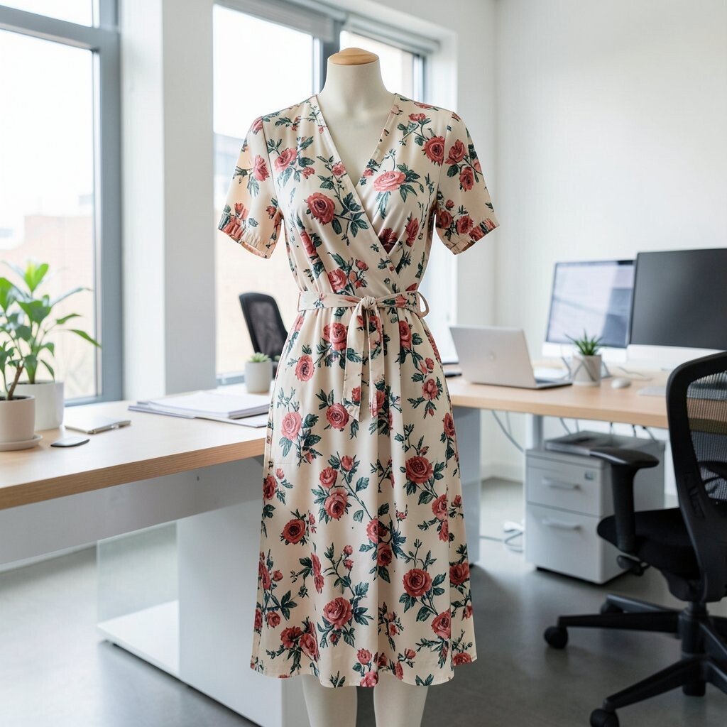 Floral prints, tiny dots, and abstract shapes can all feel office-ready when the colors stay calm. A midi wrap dress can move from desk to dinner with very little effort.
