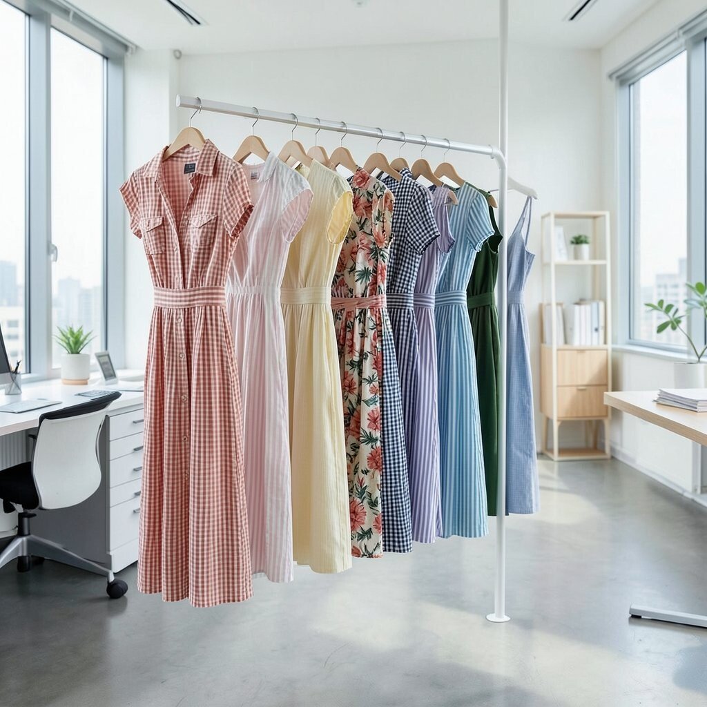 White, blue, and soft prints are popular because they feel crisp and easy. A shirt-dress shape is especially useful for office wear since it feels both simple and smart.