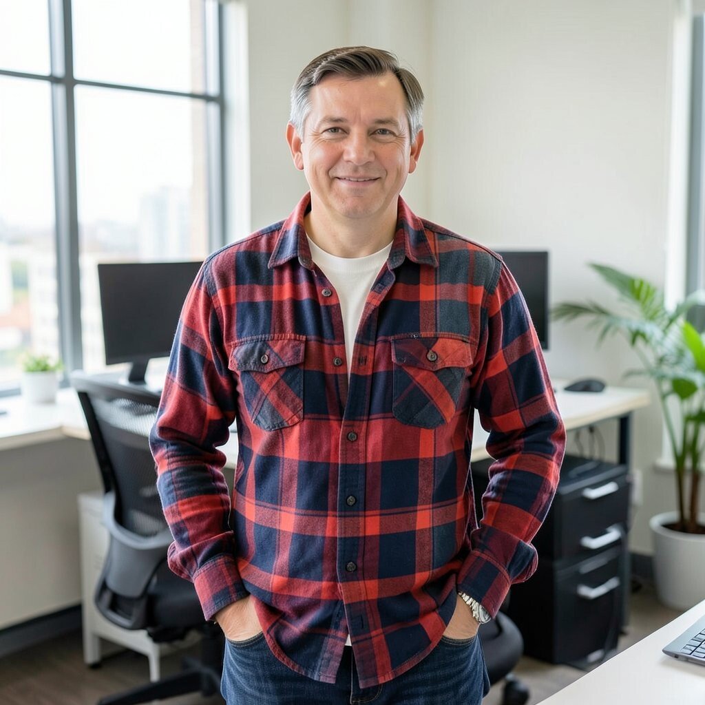 Muted plaids and solid colors are the best office-friendly choices. A slim fit helps the shirt look neater and less casual.
