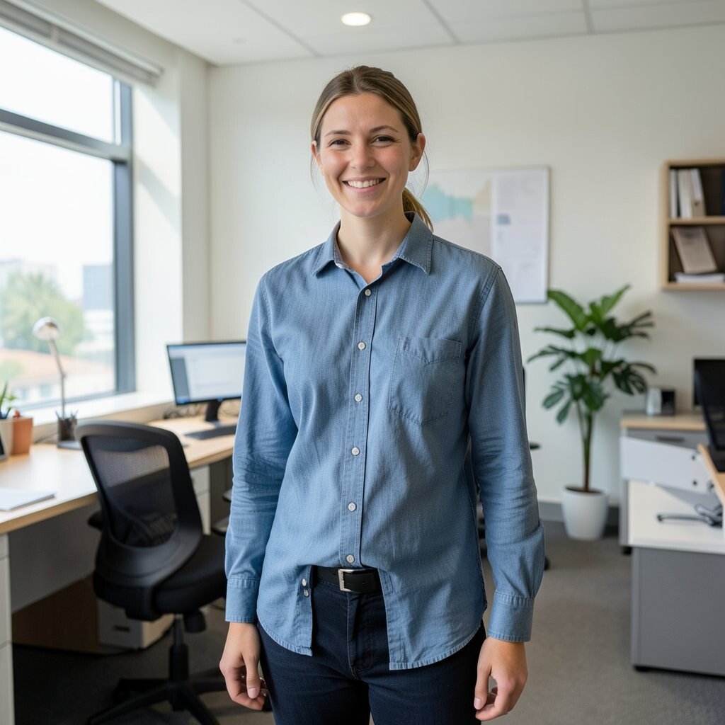 Chambray has a denim-like look, but it feels lighter and softer. It gives a relaxed office style that still looks neat and thoughtful.
