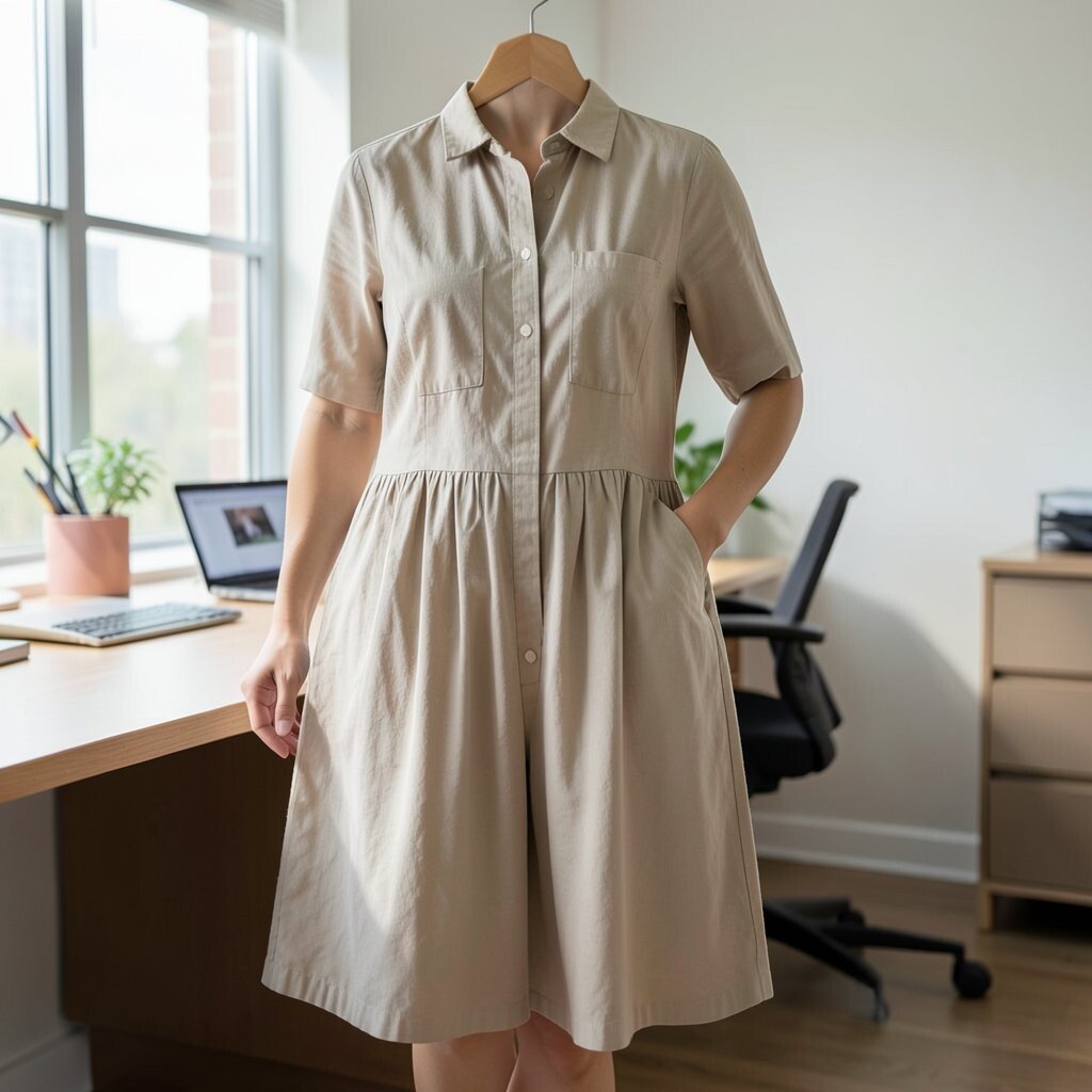This fabric is often a practical buy because it is comfortable and simple to care for. A belt can help define the waist if you want more shape. For a personal touch, try a fun button color or a sleeve detail that feels like you.