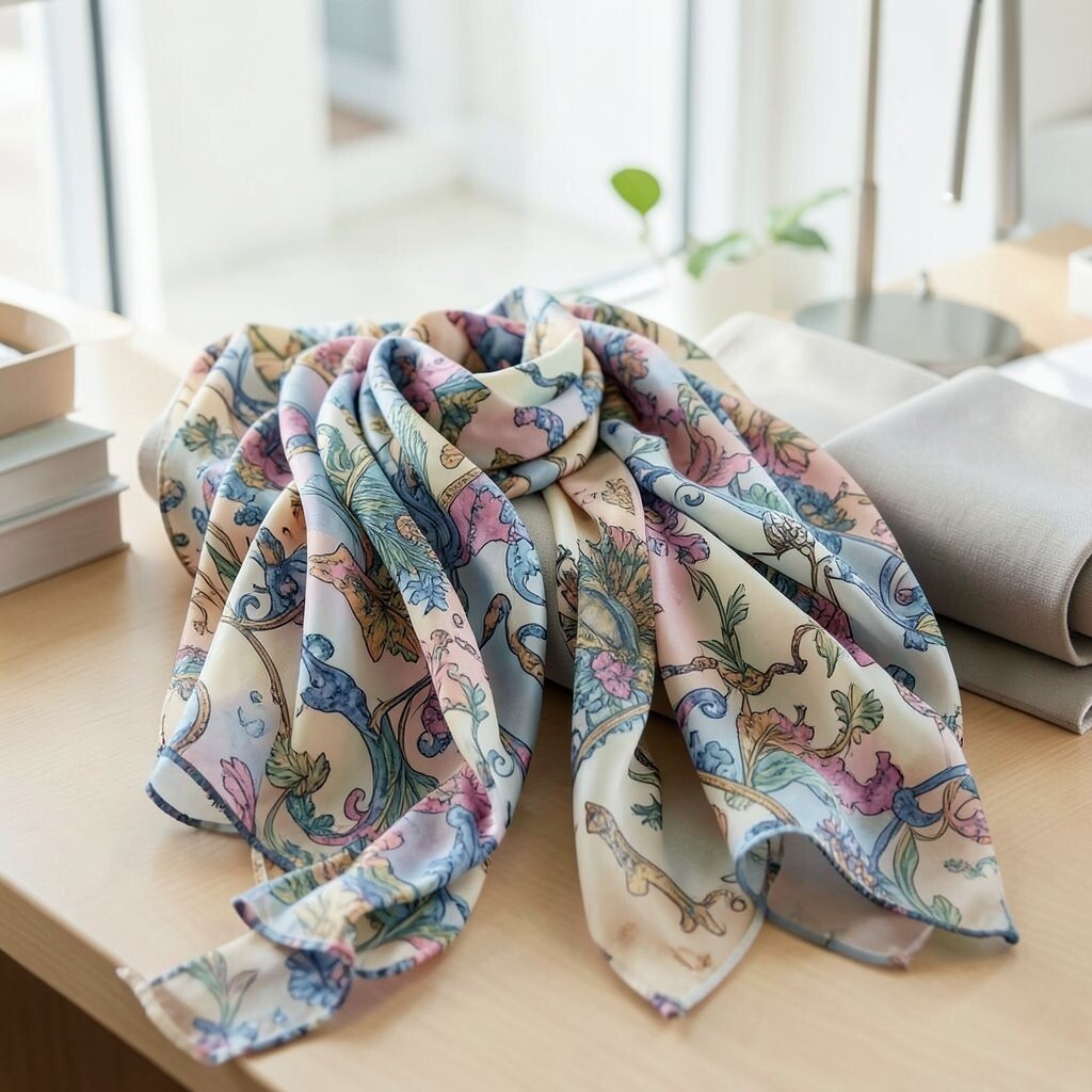 Small prints, thin borders, and soft color blends are easy to wear in the office. You can tie one at the neck, on a bag, or around a ponytail for a fresh detail.