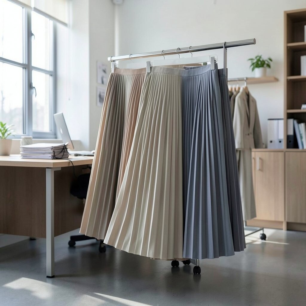 Pleated skirts bring motion and a soft, flowing shape to office clothing. They can make a simple top look more lively right away.