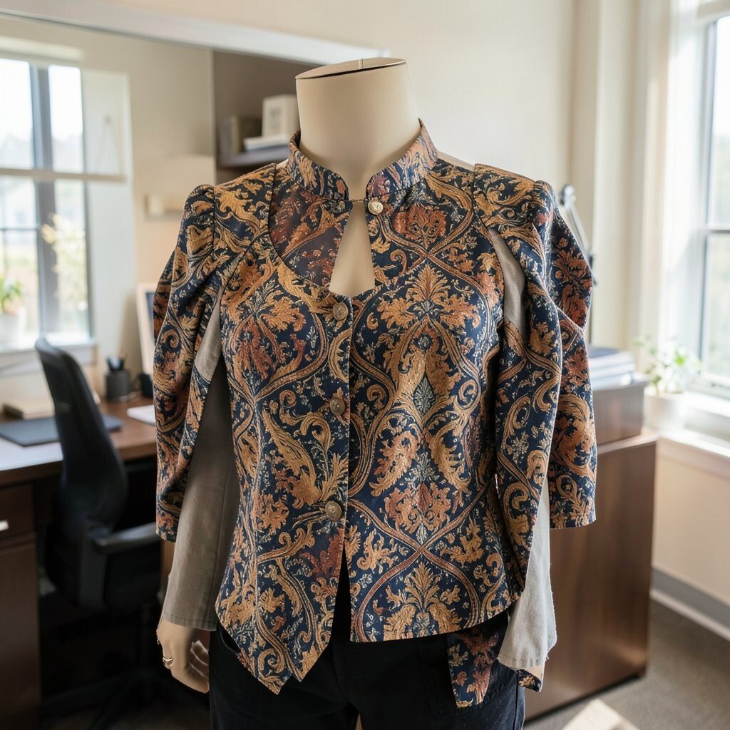 Because the fabric is ornate, it often works best as a single statement item. Cost can be higher, but the unique look may justify the spend for special days. A clean neckline or simple sleeve shape can keep the top office-appropriate.
