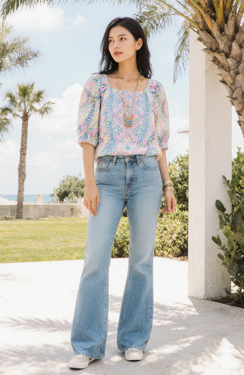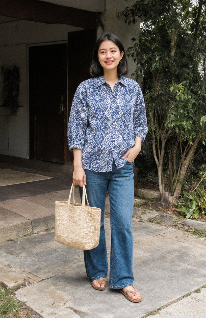 Imagine a sunny day with a perfect breeze. Pair your favorite light-wash flare jeans with a soft, pastel-colored batik blouse. The loose fit of the blouse will create a relaxed vibe, perfect for a casual outing.