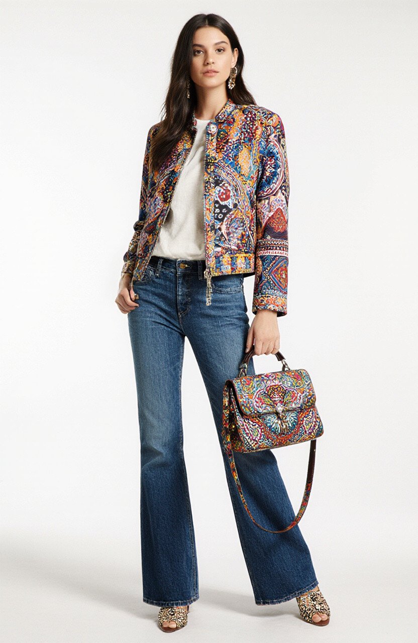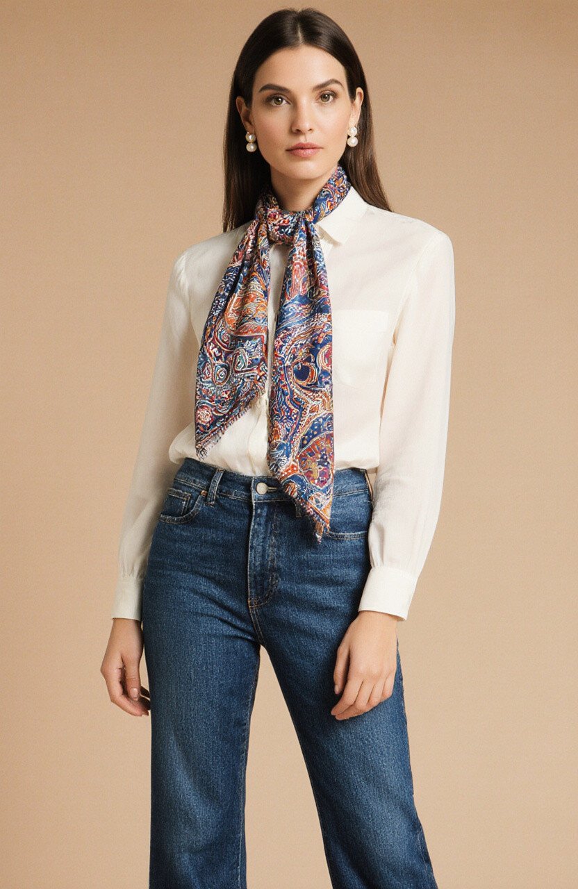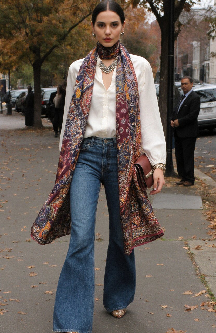 Achieve an effortlessly elegant look with flare jeans and a batik silk scarf. The scarf adds a luxurious touch to your outfit.