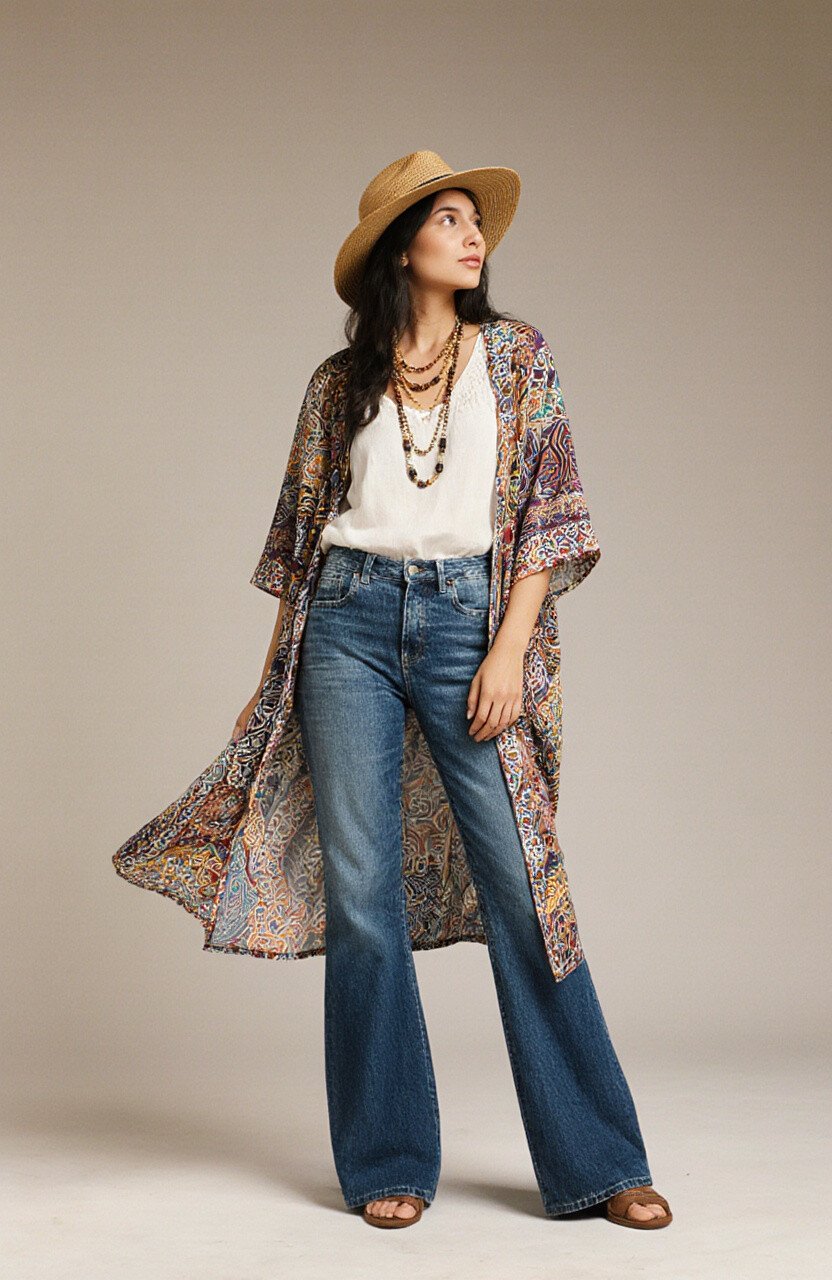 Flare jeans have always had a boho element, and when combined with a batik kimono, you get a bohemian dream outfit. The flowy nature of the kimono adds grace and style.