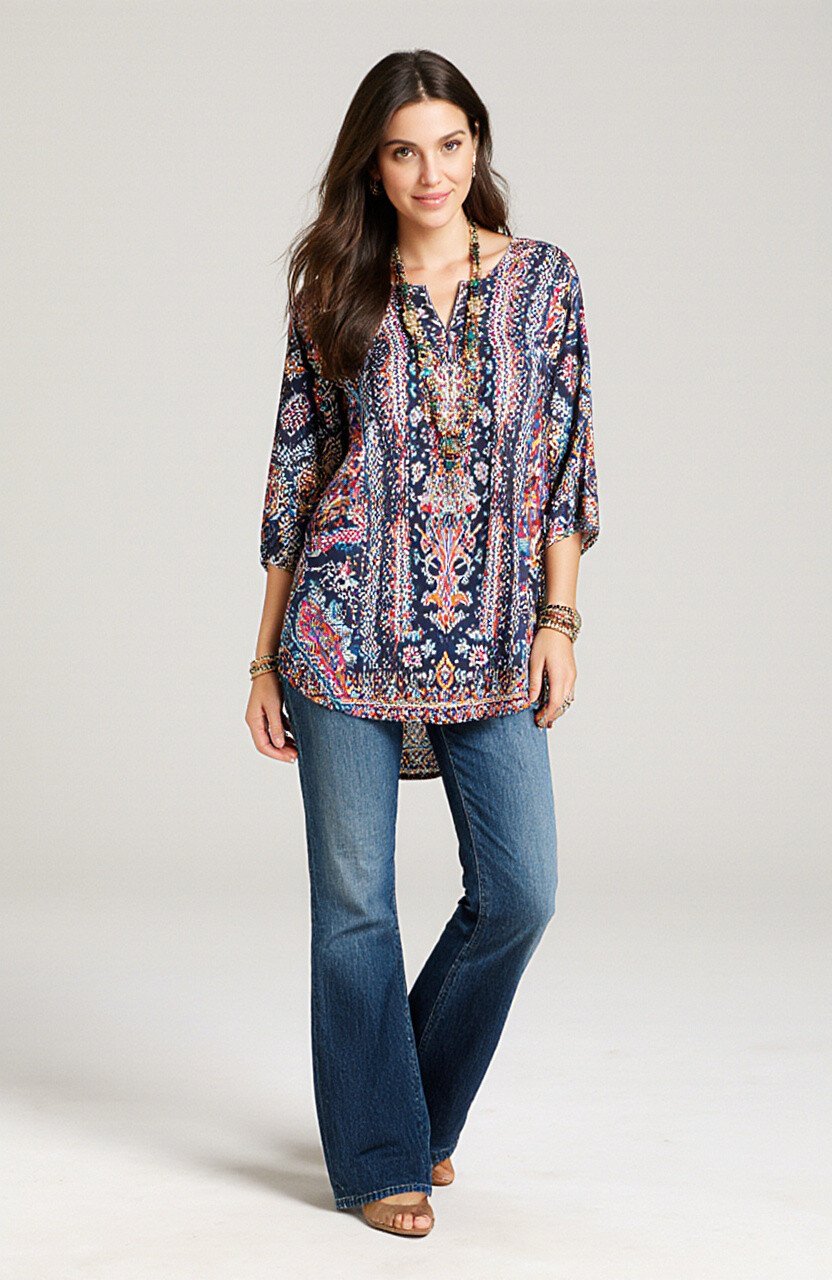 Show off your creative side with flare jeans and a batik tunic. The tunic’s length and flow add an artsy flair to your outfit.