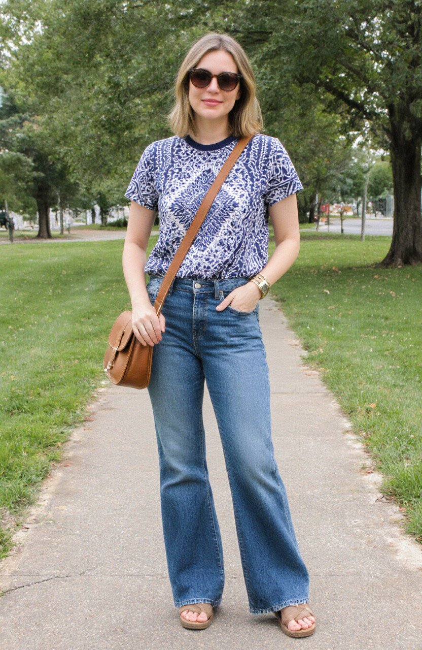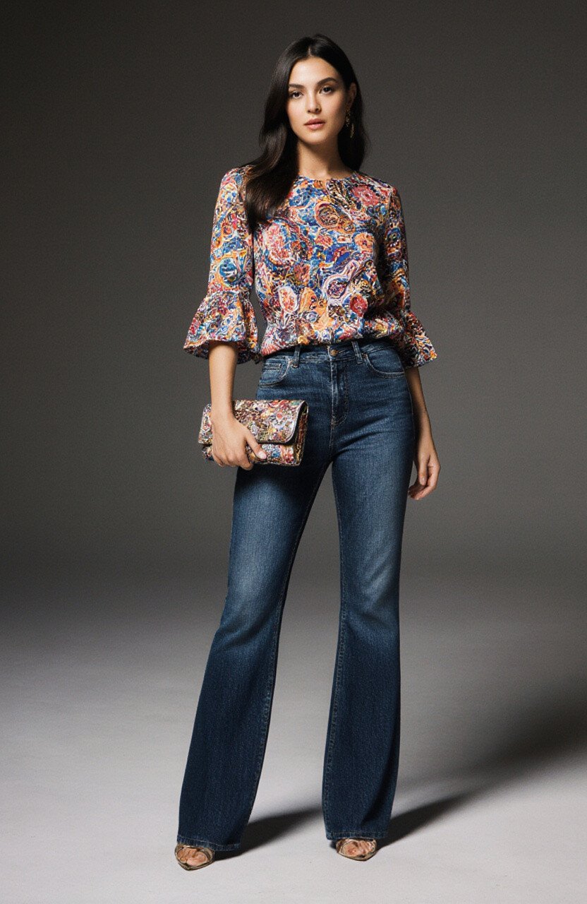 For a laid-back day, pair your flare jeans with a loose batik shirt. This combination is both comfortable and fashionable.