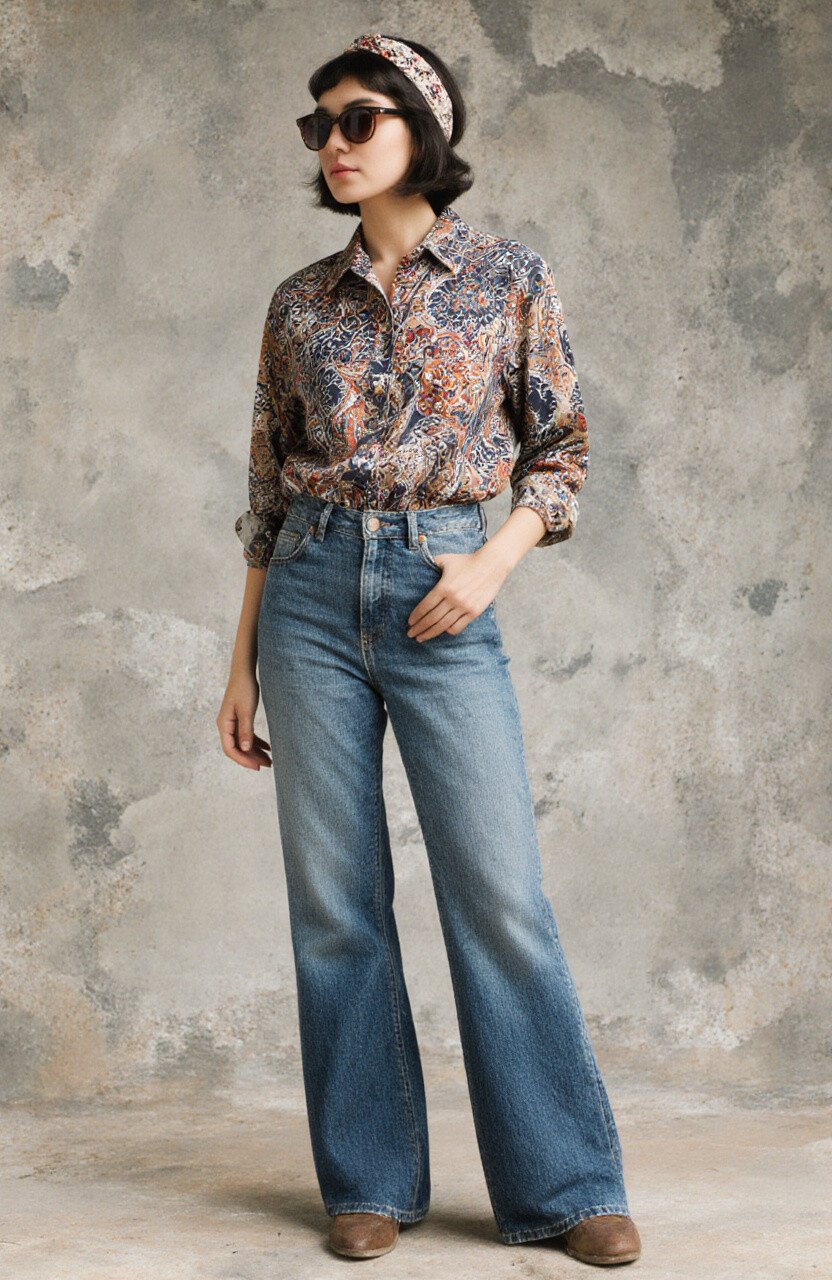Take a step back in time with vintage-inspired flare jeans and a batik button-up shirt. This look is nostalgic yet fashionable.