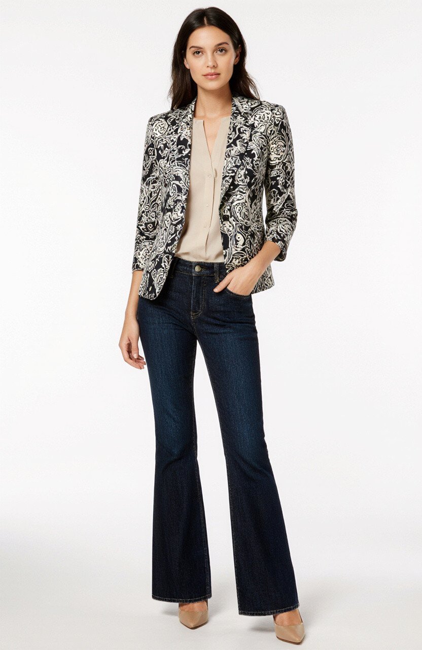 Yes, you can wear flare jeans to the office! Pair dark-wash flare jeans with a structured batik blazer. This creates a professional yet stylish look.