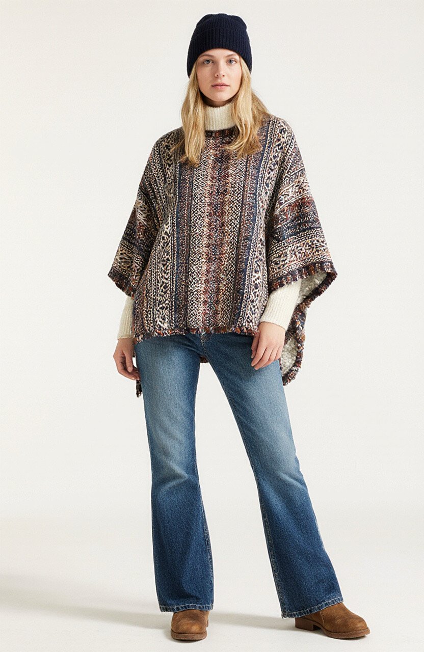 Stay cozy with flare jeans paired with a warm batik poncho. This outfit is perfect for chilly days.