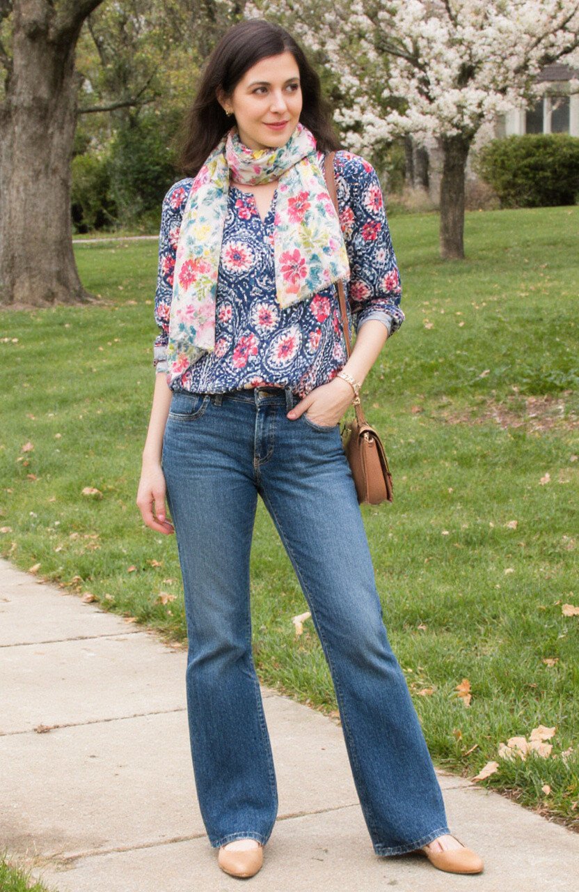 The floral patterns bring out the season’s vibrancy, while the jeans provide a classic base. Add a light scarf and some ballet flats.