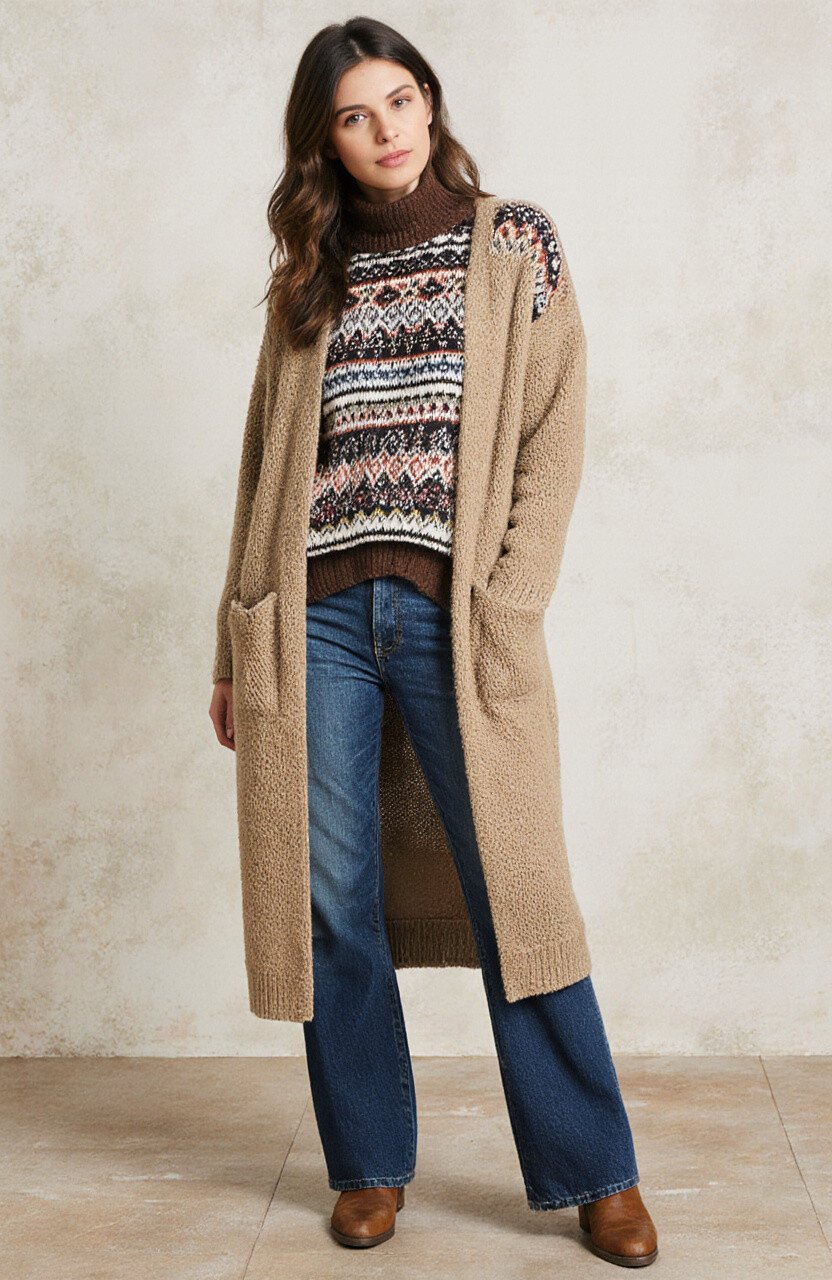 Stay warm and stylish with flare jeans, a batik sweater, and a long cardigan. This layered look is perfect for cooler days.