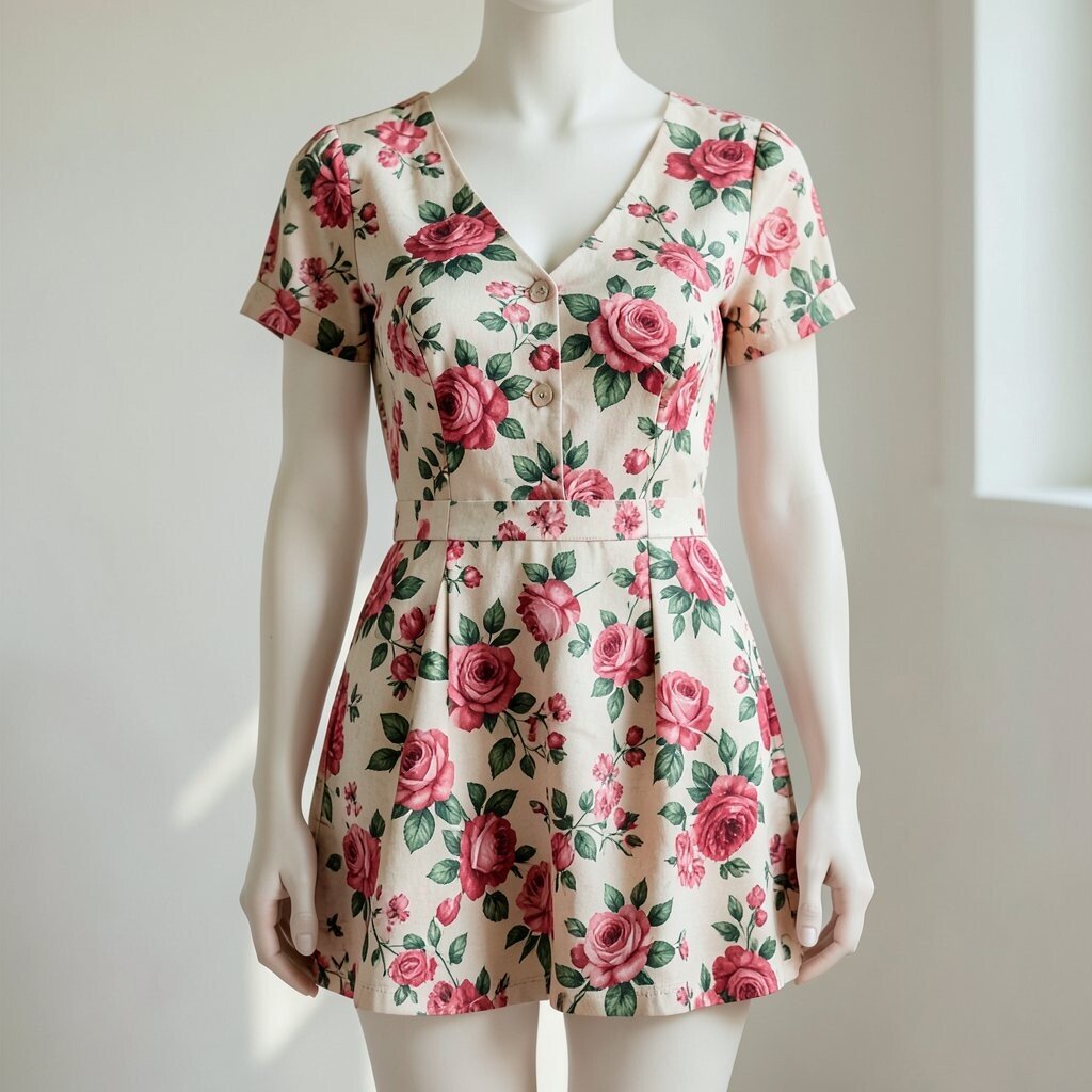 This dress channels a retro vibe with its classic rose prints in rich reds and deep greens. The vintage-inspired design is both timeless and elegant.