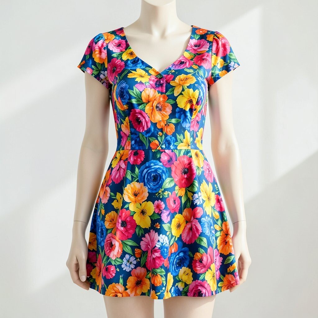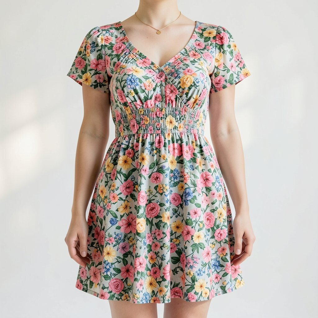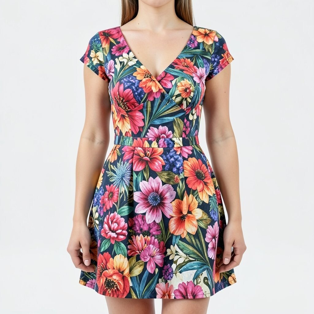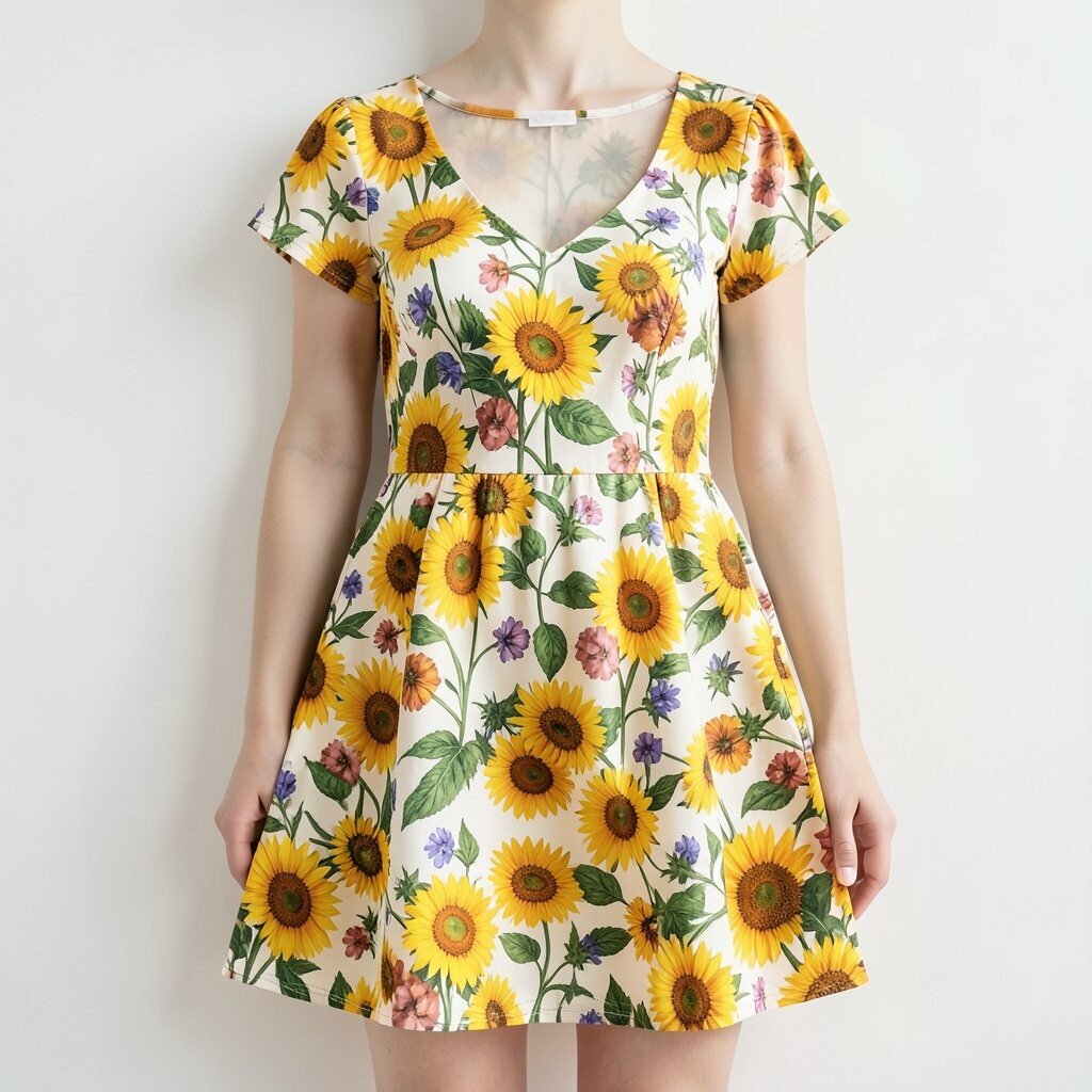 Imagine a dress adorned with bright sunflowers swaying in the gentle breeze. This floral mini dress bursts with vibrant yellow and green hues.