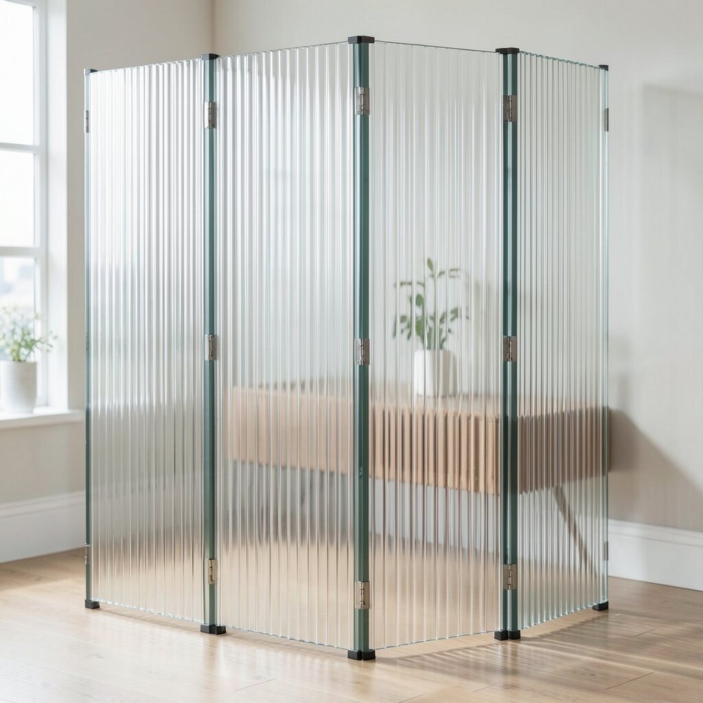 Creating distinct areas in a room without losing the open feel can be challenging. A fluted glass room divider is an excellent solution for this.