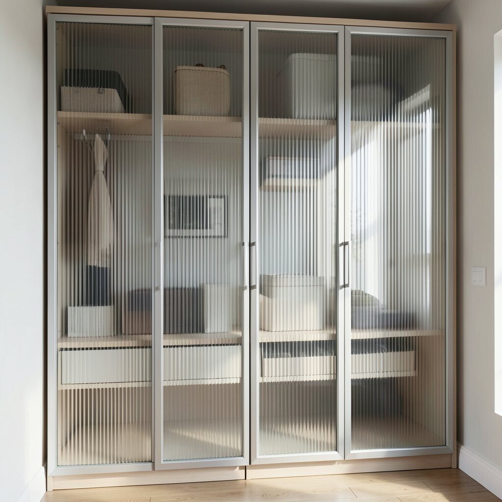 Fluted glass wardrobe doors offer a stylish solution for those wanting to blend storage with design. The glass adds a sense of depth and intrigue to your bedroom.