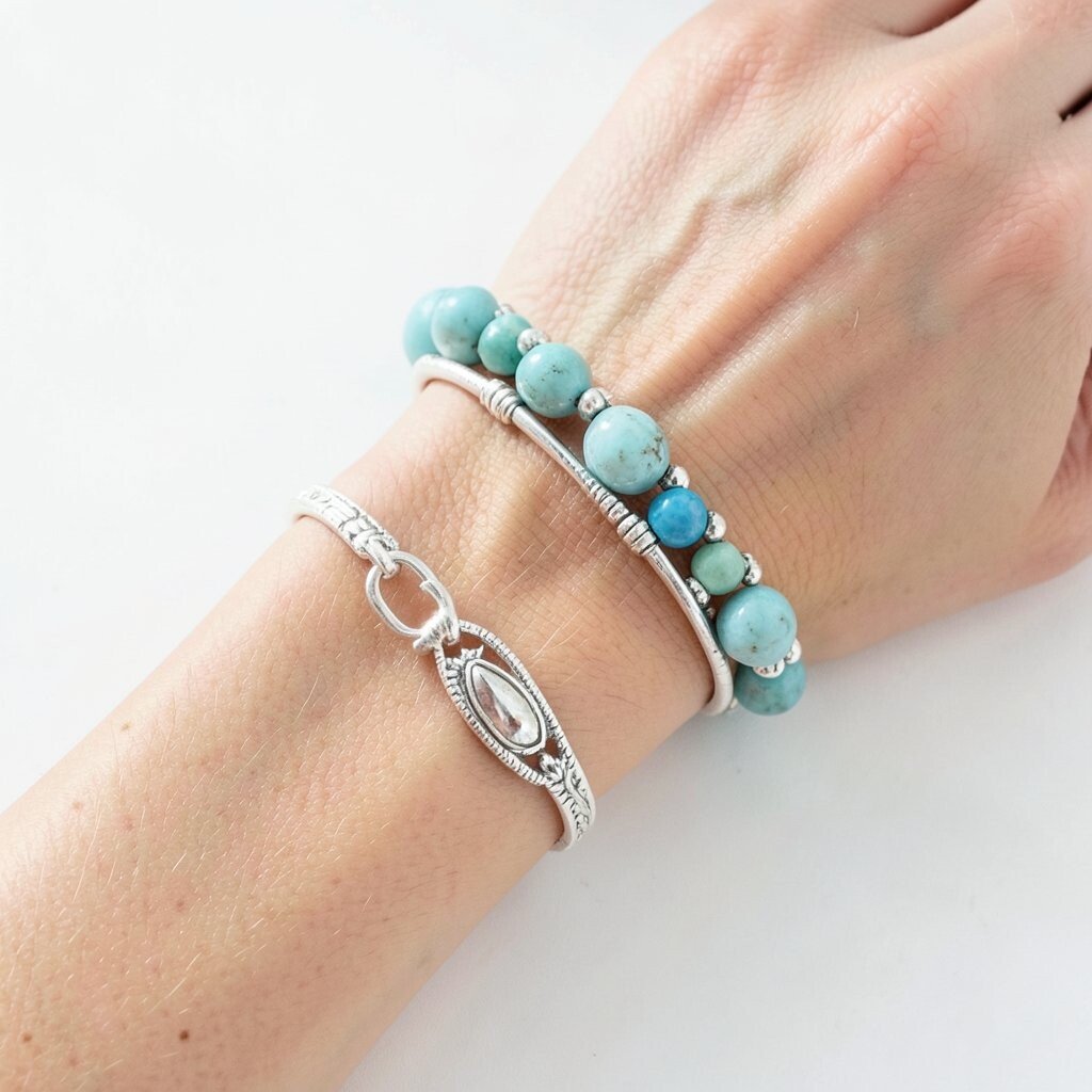 The bright pop of turquoise against the cool silver creates a striking contrast. Wear it to add a touch of color to any neutral outfit.