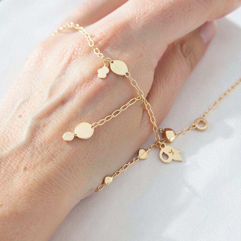 Choose charms that resonate with your personality, like stars or hearts. This type of hand chain is perfect for layering with other jewelry. It’s an affordable way to make a statement without going overboard.