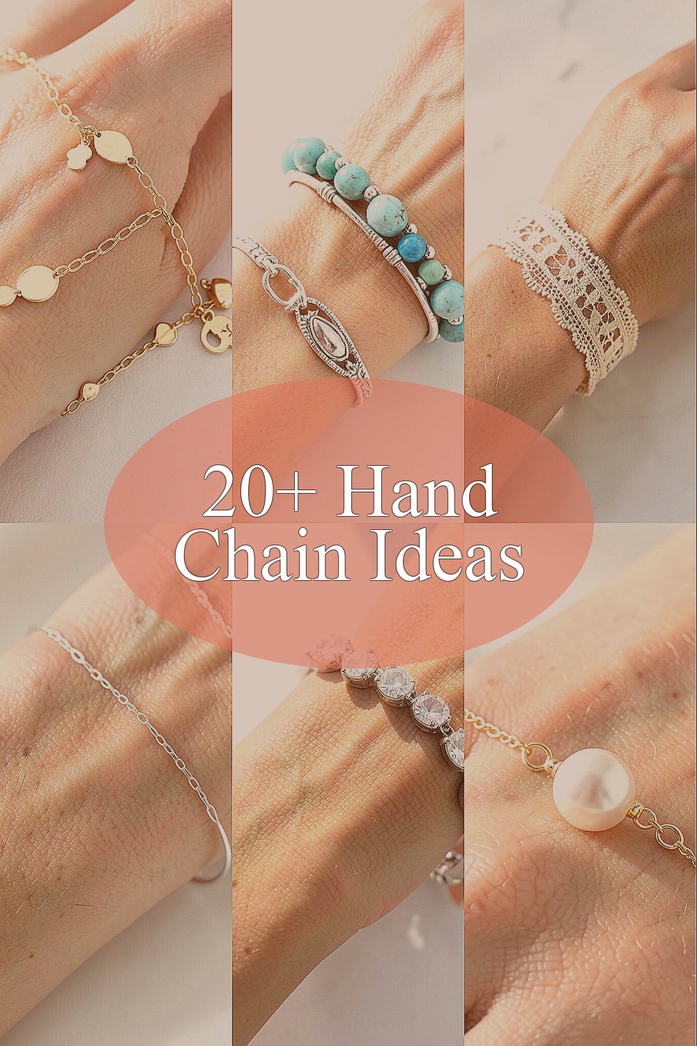A delicate gold hand chain adorned with tiny charms can be a delightful accessory. It adds a touch of whimsy to your everyday look.
